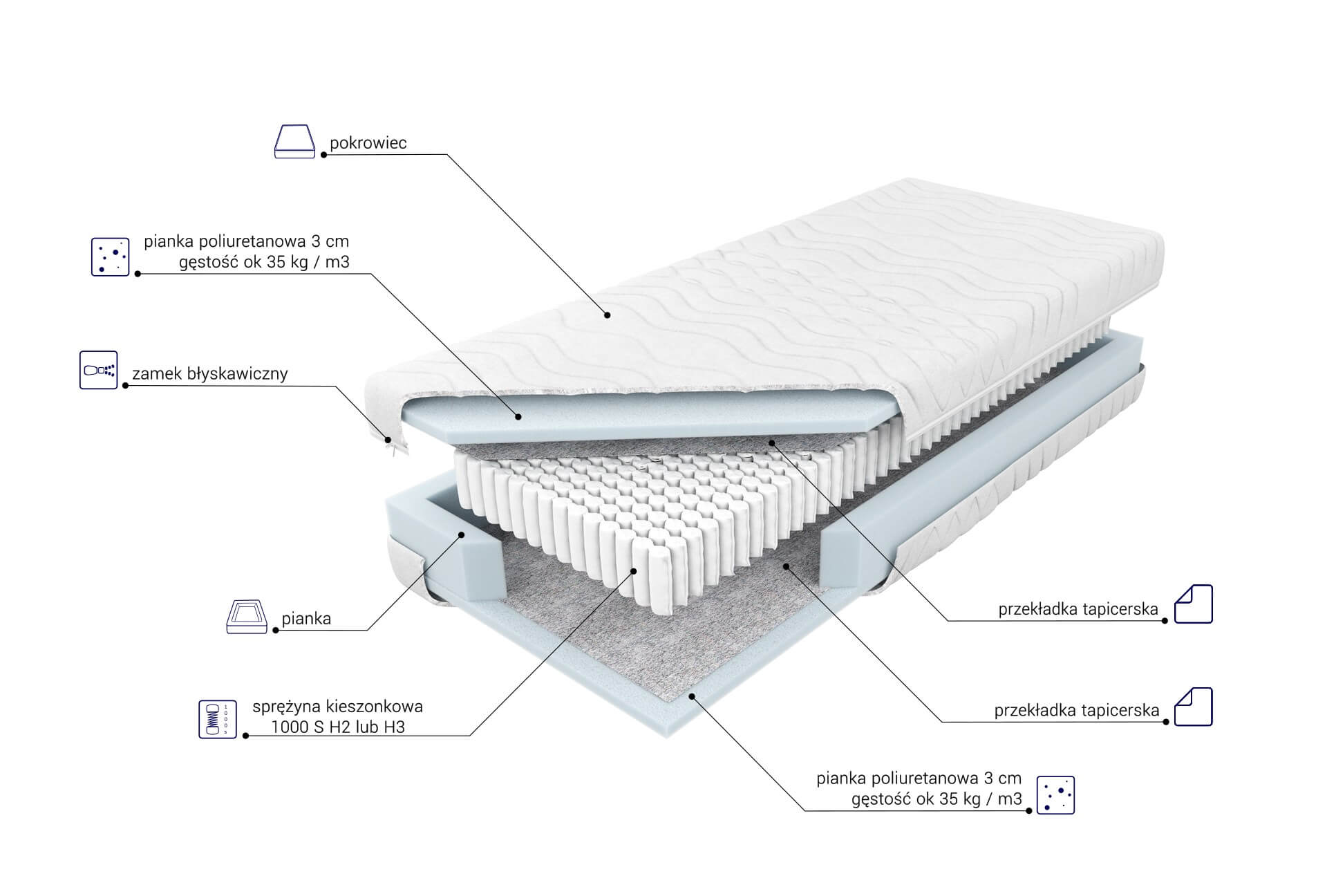 “Materac o wysokości wkładu ok. 19 cm zbudowany ze sprężyn 1000S z wysokogatunkowego drutu, umieszczonych w pojedynczych kieszonkach o średnicy 39 mm. Takie rozwiązanie poprawia elastyczność i zwiększa punktowe podparcie ciała. Istnieje możliwość wyboru sprężyn jedno lub siedmiopolowych. Materac siedmiopolowy posiada siedem stref twardości utrzymujących poszczególne części ciała w naturalnym położeniu, wynikającym z budowy anatomicznej. Po obu stronach materaca została użyta 3 cm warstwa pianki poliuretanowej charakteryzującej się długą trwałością. Obustronnie zastosowana siatka tapicerska wzmacnia konstrukcję materaca i wspomaga jego wentylację. Zastosowanie zamka błyskawicznego, który umożliwia zdjęcie i wypranie pokrowca, znacząco ułatwia utrzymanie go w czystości.”