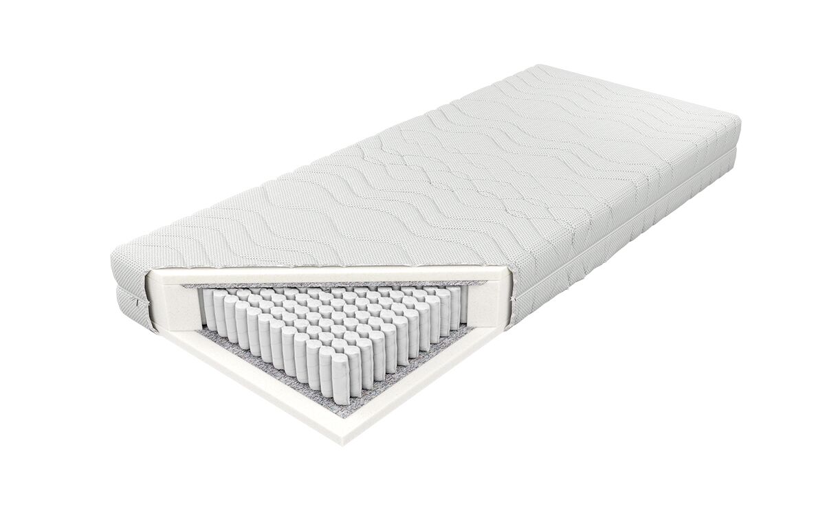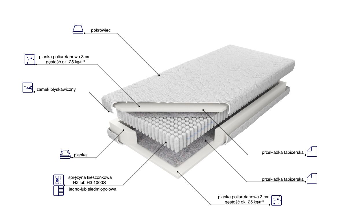 “Materac o wysokości wkładu ok. 19 cm zbudowany jest ze sprężyn 1000S z wysokogatunkowego drutu, umieszczonych w pojedynczych kieszonkach o średnicy 3,9 cm. Takie rozwiązanie poprawia elastyczność i zwiększa punktowe podparcie ciała. Istnieje możliwość wyboru sprężyn jedno lub siedmiopolowych. Materac siedmiopolowy posiada siedem stref twardości utrzymujących poszczególne części ciała w naturalnym położeniu, wynikającym z budowy anatomicznej. Po obu stronach materaca została użyta 3 cm warstwa pianki poliuretanowej charakteryzującej się długą trwałością. Zastosowanie zamka błyskawicznego, który umożliwia zdjęcie i wypranie pokrowca, znacząco ułatwia utrzymanie go w czystości.”