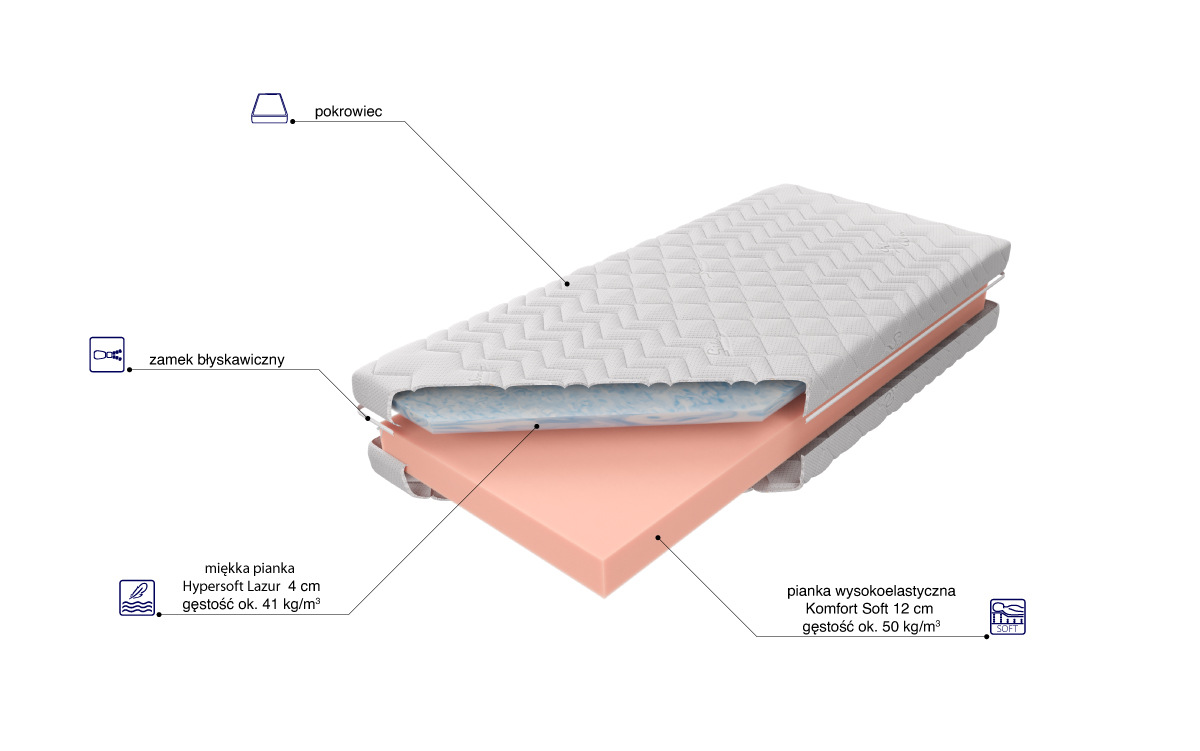 “Materac o wysokości wkładu ok. 16 cm zbudowany jest z 12 cm wysokoelastycznej pianki Komfort Soft lub Komfort Hard, połączonej z 4 cm higieniczną i wytrzymałą pianką Lazur. Jest to miękka pianka Hypersoft charakteryzuje się wysoką trwałością i miękkością. Zapewnia optymalne podparcie dla kręgosłupa, a jednocześnie jest delikatna i puszysta. Dzięki otwartej strukturze komórkowej umożliwia swobodny przepływ powietrza, skutecznie zapobiegając przegrzewaniu się ciała. Istnieje możliwość wyboru poziomu twardości materaca. Utrzymanie wysokiego poziomu czystości zapewnia zamek błyskawiczny umożliwiający zdjęcie pokrowca.Uchwyty zastosowane w pokrowcach pikowanych, dostępne w materacach o szerokości do 140 cm włącznie, zostały zaprojektowane z myślą o wygodnym podnoszeniu i obracaniu materaca.”