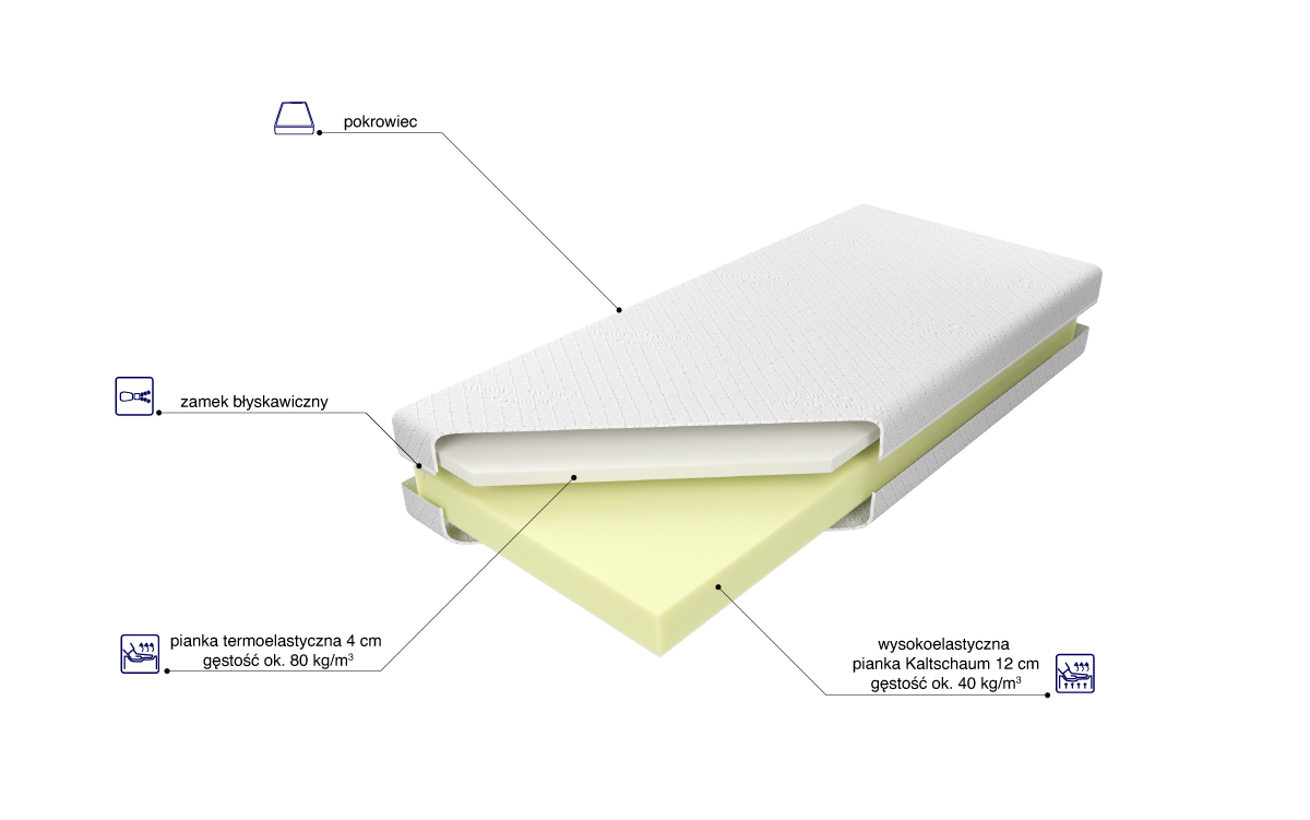 “Materac o wysokości wkłądu ok. 16 cm zbudowany jest z 12 cm wysokoelastycznej pianki Kaltschaum o zwiększonej sprężystości, która dopasowuje się do kształtu ciała oraz 4 cm komfortowej, termoelastycznej pianki. Istnieje możliwość wyboru poziomu twardości materaca. Utrzymanie wysokiego poziomu higieny zapewnia zamek błyskawiczny umożliwiający zdjęcie pokrowca. Uchwyty zastosowane w pokrowcach pikowanych, dostępne w materacach o szerokości do 140 cm włącznie, zostały zaprojektowane z myślą o wygodnym podnoszeniu i obracaniu materaca.”