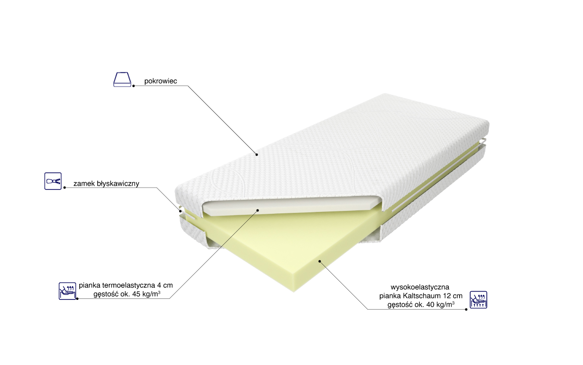 “Materac o wysokości wkładu ok. 16 cm zbudowany jest z 12 cm wysokoelastycznej pianki Kaltschaum o zwiększonej sprężystości, która dopasowuje się do kształtu ciała oraz 4 cm komfortowej, termoelastycznej pianki. Istnieje możliwość wyboru poziomu twardości materaca. Utrzymanie wysokiego poziomu higieny zapewnia zamek błyskawiczny umożliwiający zdjęcie pokrowca. Uchwyty zastosowane w pokrowcach pikowanych, dostępne w materacach o szerokości do 140 cm włącznie, zostały zaprojektowane z myślą o wygodnym podnoszeniu i obracaniu materaca.”