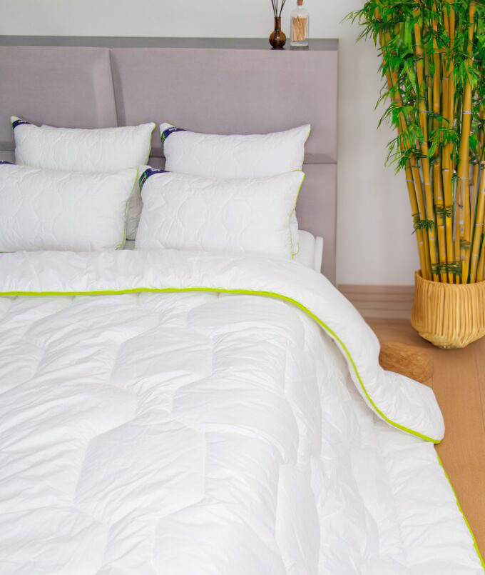 Materiał pokryciowy to innowacyjna tkanina, łącząca najlepsze cechy bawełny i bambusa. Bawełna zapewnia miękkość, a bambus nadaje tkaninie aksamitności oraz właściwości antybakteryjnych i antygrzybicznych.