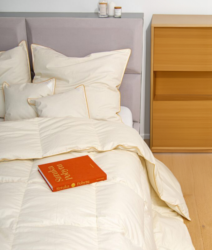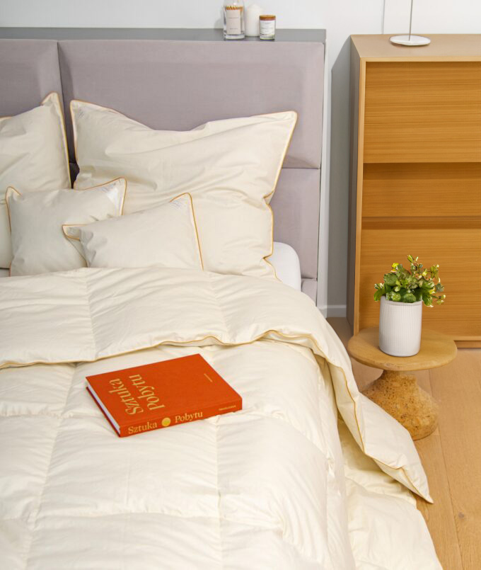 Całoroczna kołdra wypełniona puchem gęsim o podwyższonej jakości. Jest to polski produkt, uszyty z dbałością o najmniejszy detal. Wyrób naturalny, zbudowany z jakościowych surowców, które zapewniają odpowiednią cyrkulację powietrza oraz optymalny poziom wilgotności.