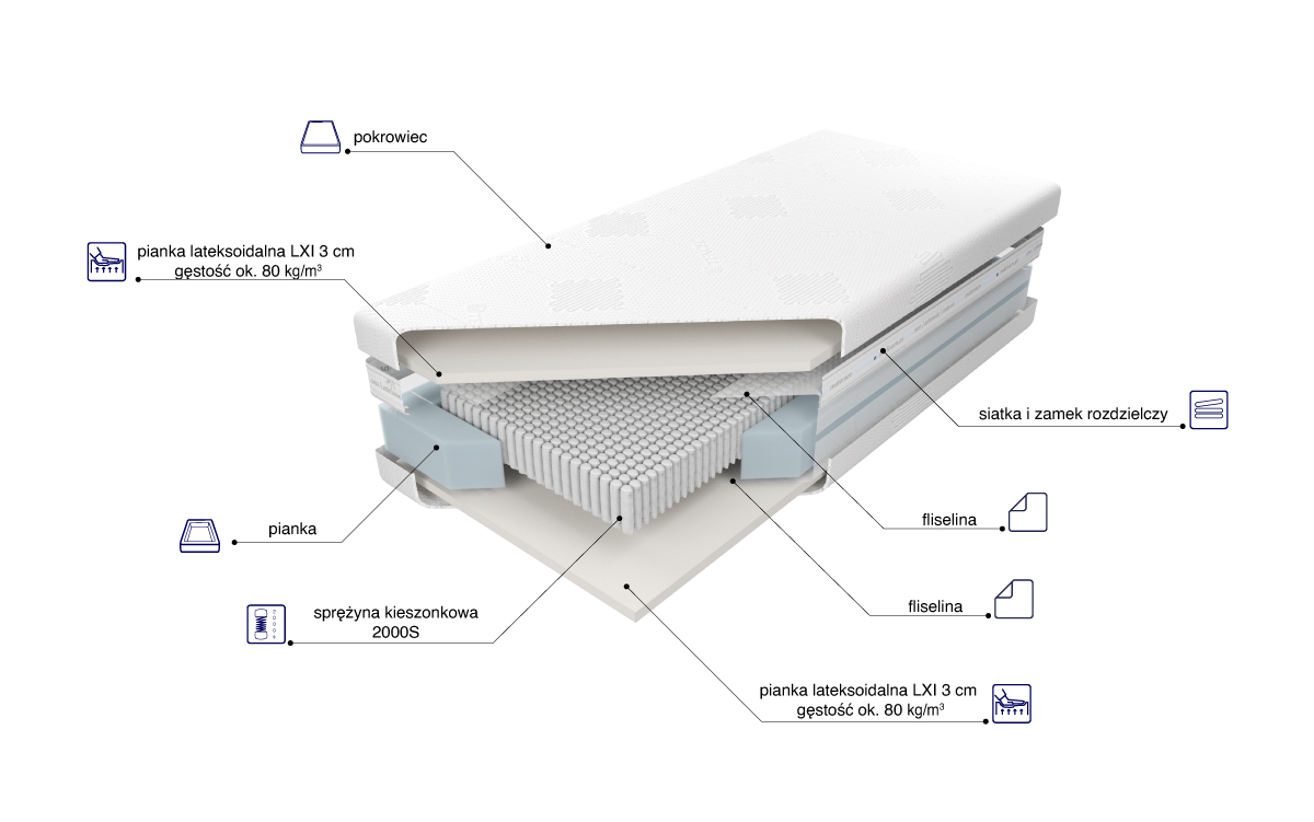 “Materac o wysokości wkładu ok. 22 cm zbudowany jest ze sprężyn 2000S z wysokogatunkowego drutu, umieszczonych w pojedynczych kieszonkach o średnicy 2,5 cm. Ilość użytych sprężyn znacząco poprawia elastyczność i zwiększa punktowe podparcie ciała. Po obu stronach została użyta 3 cm warstwa pianki lateksoidalnej antygrzybicznej, antyroztoczowej i antybakteryjnej. Pianka ta cechuje się dużą odpornością na odkształcenia i przewiewnością. Zastosowanie zamka błyskawicznego, który umożliwia zdjęcie i wypranie pokrowca, znacząco ułatwia utrzymanie go w czystości.”