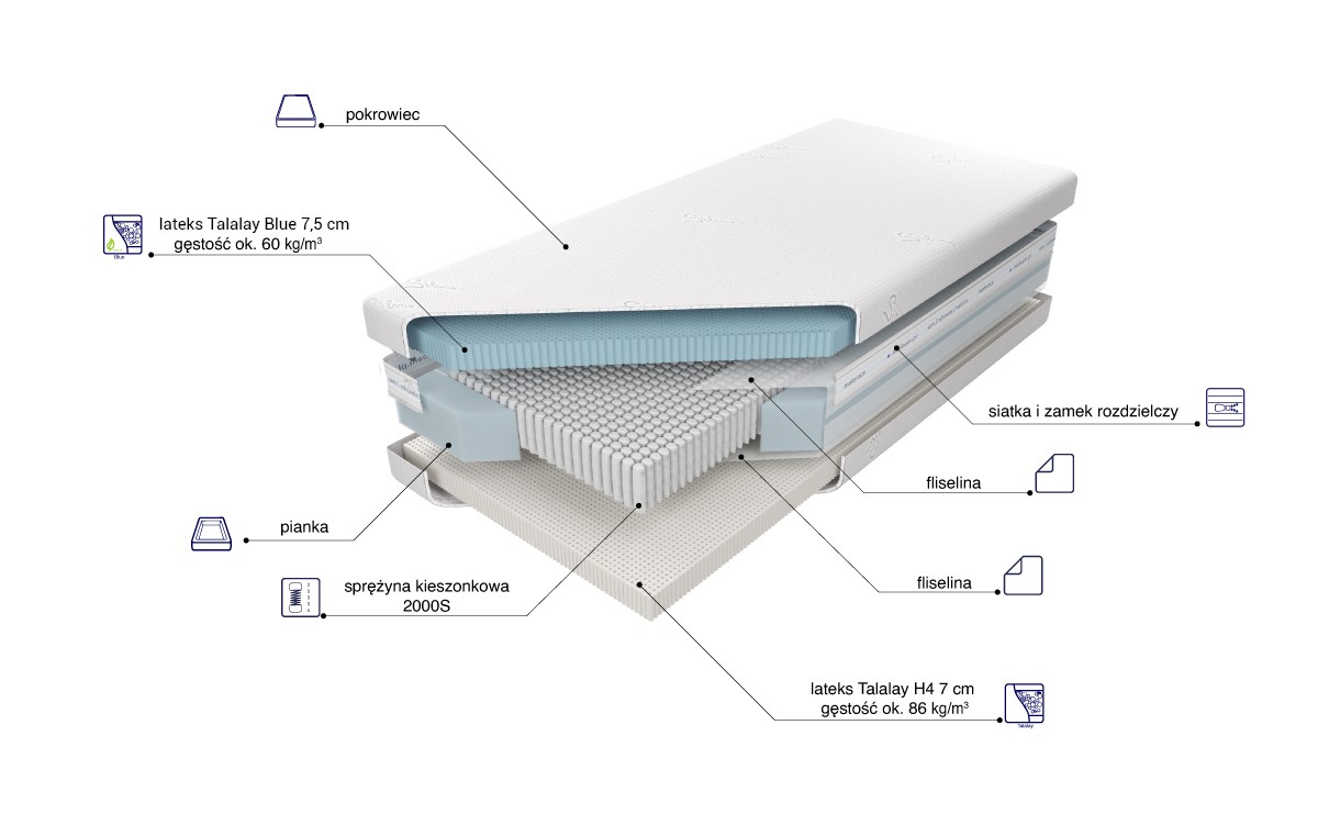 “Materac o wysokości wkładu ok. 26,5 cm zbudowany ze sprężyn 2000S z wysokogatunkowego drutu, umieszczonych w pojedynczych kieszonkach o średnicy 2,5 cm. Ilość użytych sprężyn znacząco poprawia elastyczność i zwiększa punktowe podparcie ciała. Z jednej strony materaca użyta została 7,5 cm warstwa lateksu Talalay Blue, posiadającego umiejętność utrzymania równowagi cieplnej. Odpowiednio oddaje lub pobiera energię w zależności od wahań temperatury, eliminując problem z potliwością. Otwartokomórkowa struktura podnosi poziom cyrkulacji powietrza. Zapewnia optymalne podparcie i komfort. Z drugiej strony znajduje się 7 cm warstwa lateksu Talalay, produkowanego na bazie naturalnego mleczka kauczukowego i lateksu syntetycznego, o otwartokomórkowej strukturze, zapewniającego wentylację i cyrkulację powietrza w materacu, dającego optymalne podparcie, wpływającego na komfort i wypoczynek. Utrzymanie pokrowca w czystości ułatwia zastosowanie w nim zamka błyskawicznego, który umożliwia zdjęcie z materaca i wypranie.”