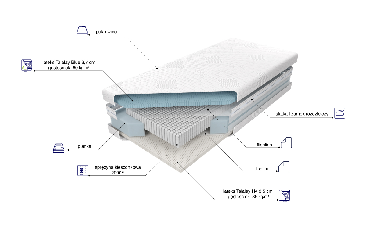 “Materac o wysokości wkładu ok. 19,2 cm zbudowany jest ze sprężyn 2000S z wysokogatunkowego drutu, umieszczonych w pojedynczych kieszonkach o średnicy 2,5 cm. Ilość użytych sprężyn znacząco poprawia elastyczność i zwiększa punktowe podparcie ciała. Z jednej strony materaca użyta została 3,7 cm warstwa lateksu Talalay Blue, posiadającego umiejętność utrzymania równowagi cieplnej. Odpowiednio oddaje on lub pobiera energię ciała w zależności od wahań temperatury, eliminując problem z potliwością. Otwartokomórkowa struktura podnosi poziom cyrkulacji powietrza w materacu. Zapewnia optymalne podparcie i komfort. Z drugiej strony materaca znajduje się 3,5 cm warstwa lateksu Talalay, produkowanego na bazie naturalnego mleczka kauczukowego i lateksu syntetycznego, o otwartokomórkowej strukturze, zapewniającego wentylację i cyrkulację powietrza, dającego optymalne podparcie, wpływającego na komfort i wypoczynek. Utrzymanie pokrowca w czystości ułatwia zastosowanie w nim zamka błyskawicznego, który umożliwia zdjęcie z materaca i wypranie.”