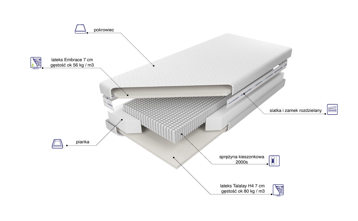“Materac o wysokości wkładu ok. 26 cm zbudowany jest ze sprężyn 2000S z wysokogatunkowego drutu, umieszczonych w pojedynczych kieszonkach o średnicy 2,5 cm. Ilość użytych sprężyn znacząco poprawia elastyczność i zwiększa punktowe podparcie ciała. Z jednej strony materaca użyta została 7 cm warstwa niezwykle elastycznego lateksu Talalay Embrace łączącego zalety Talalay i pianki termoelastycznej. Idealnie dopasowuje się do budowy anatomicznej użytkownika a jego otwartokomórkowa struktura podnosi poziom cyrkulacji powietrza w materacu. Z drugiej strony znajduje się 7 cm warstwa lateksu Talalay, produkowanego na bazie naturalnego mleczka kauczukowego i lateksu syntetycznego, o otwartokomórkowej strukturze, zapewniającego wentylację i cyrkulację powietrza, dającego optymalne podparcie, wpływającego na komfort wypoczynku. Utrzymanie pokrowca w czystości ułatwia zastosowanie w nim zamka błyskawicznego, który umożliwia zdjęcie z materaca i wypranie.”