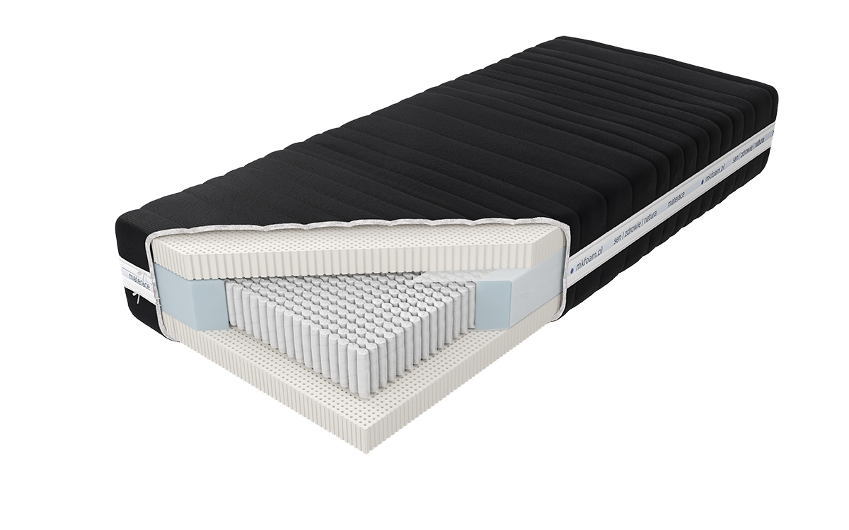“Wkład materaca o wysokości ok. 26 cm zbudowany jest ze sprężyn 2000S z wysokogatunkowego drutu, umieszczonych w pojedynczych kieszonkach o średnicy 25 mm. Ilość użytych sprężyn znacząco poprawia elastyczność i zwiększa punktowe podparcie ciała. Po obu stronach użyta została 7 cm warstwa naturalnego lateksu Talalay, produkowanego na bazie naturalnego mleczka kauczukowego, o otwartokomórkowej strukturze sprzyjającej doskonałej wentylacji i cyrkulacji powietrza. Zapewnia optymalne podparcie ciała, wpływając na komfort wypoczynku. Utrzymanie pokrowca w czystości ułatwia zastosowanie w nim zamka błyskawicznego, który umożliwia zdjęcie z materaca i wypranie.”