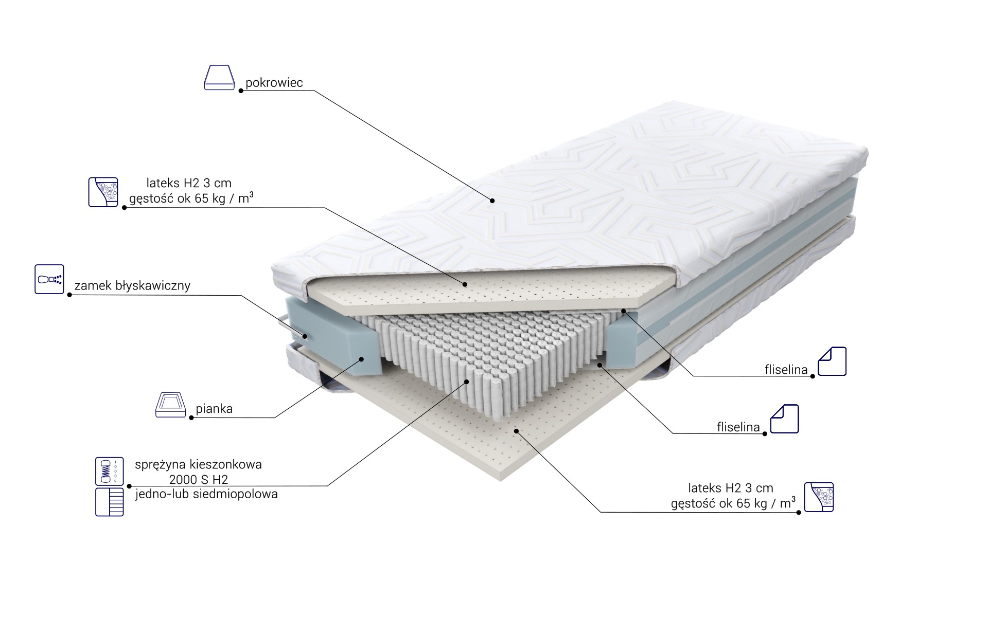 “Materac o wysokości wkładu ok. 22 cm zbudowany ze sprężyn 2000S z wysokogatunkowego drutu, umieszczonych w pojedynczych kieszonkach o średnicy 2,5 cm. Ilość użytych sprężyn znacząco poprawia elastyczność i zwiększa punktowe podparcie ciała. Po obu stronach materaca została użyta 3 cm warstwa lateksu o dużej gęstości zapewniającego optymalne podparcie i komfort podczas snu. Posiada właściwości antygrzybiczne, antyroztoczowe i antybakteryjne, cechuje się długą żywotnością. Zastosowanie zamka błyskawicznego, który umożliwia zdjęcie i wypranie pokrowca, znacząco ułatwia utrzymanie go w czystości.”