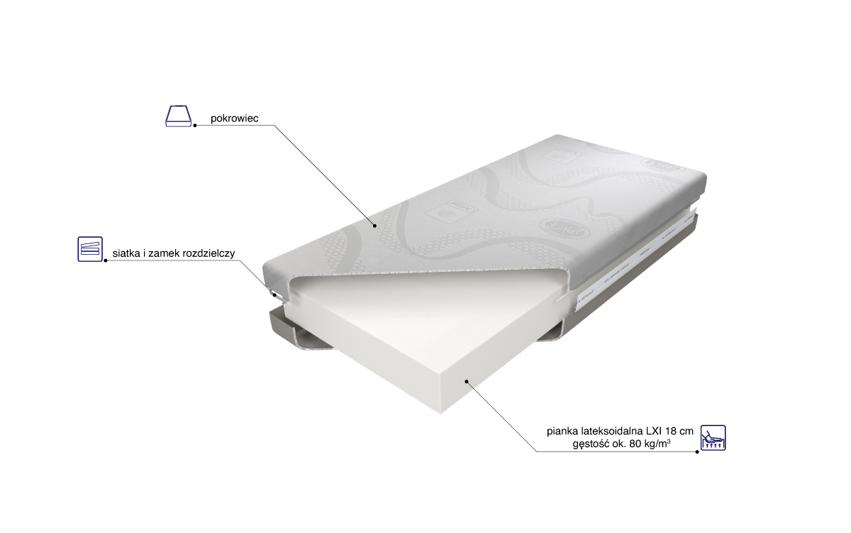 Pianka lateksoidalna LXI posiada dużą elastyczność punktową, dzięki której idealnie dopasowuje się do budowy anatomicznej użytkownika, stanowiąc optymalną podporę dla kręgosłupa. Nie gromadzi roztoczy, jest polecana dla alergików.