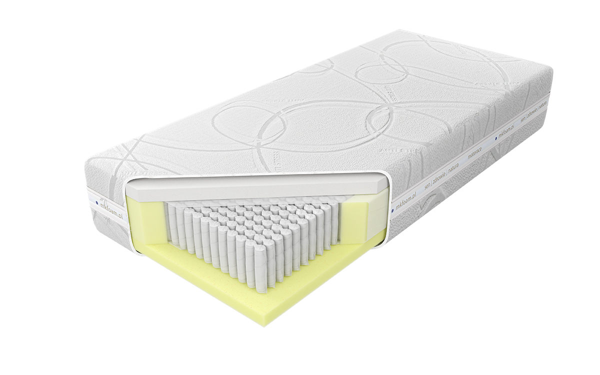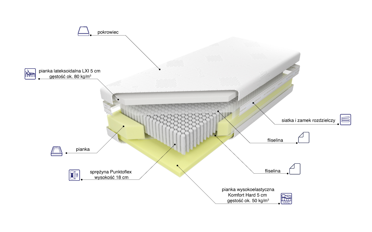 “Materac o wysokości wkładu ok. 28 cm zbudowany jest ze sprężyn Punktoflex z wysokogatunkowego drutu, umieszczonych w pojedynczych kieszonkach o średnicy 4 cm. Ilość użytych sprężyn znacząco poprawia elastyczność i zwiększa punktowe podparcie ciała. Zastosowane 18 cm sprężyny wpływają na wyjątkową wysokość i podnoszą przewiewność materaca. Z jednej jego strony znajduje się 5 cm warstwa antybakteryjnej i antyroztoczowej pianki lateksoidalnej o dużej elastyczności punktowej, zapewniającej idealne dopasowanie produktu do budowy anatomicznej użytkownika, a tym samym doskonałą podporę dla kręgosłupa. Z drugiej strony użyta została 5 cm wysokoelastyczna pianka Komfort Hard, cechująca się zwiększoną gęstością i twardością, zapewniająca optymalne podparcie kręgosłupa. Istnieje możliwość wyboru twardości materaca, klient decyduje o twardości sprężyn H2 lub H3. Utrzymanie pokrowca w czystości ułatwia zastosowanie w nim zamka błyskawicznego, który umożliwia zdjęcie z materaca i wypranie.”
