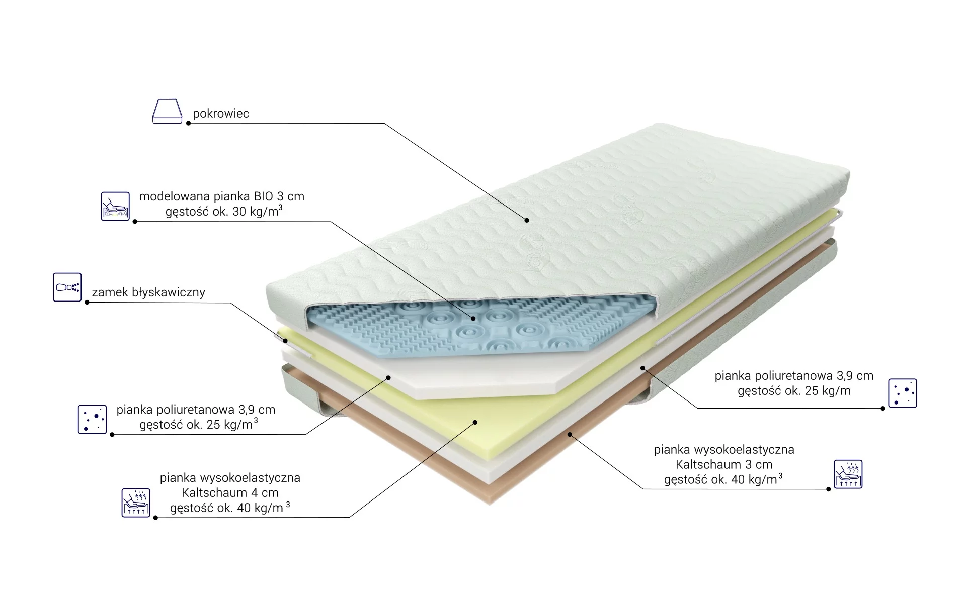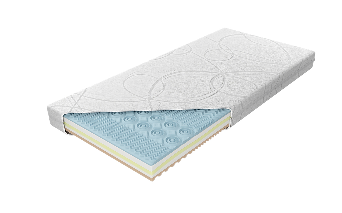 “Materac o wysokości wkładu ok. 17,8 cm zbudowany jest z kilku warstw. Pierwszą stanowi sprężysta i modelowana pianka BIO, która dzięki swojej strukturze delikatnie masuje, poprawiając ukrwienie ciała osoby odpoczywającej, zapewnia optymalną cyrkulację powietrza. Kolejne zastosowane komponenty to dwie warstwy wytrzymałej, elastycznej pianki poliuretanowej przeplatanej dwoma powłokami wysokoelastycznej pianki Kaltschaum, cechującej się zwiększoną sprężystością, dającej możliwość optymalnej ergonomii i podparcia ciała. Materac posiada siedem stref twardości utrzymujących poszczególne części ciała w położeniu dopasowanym do budowy anatomicznej. Utrzymanie wysokiego poziomu czystości zapewnia zamek błyskawiczny umożliwiający zdjęcie pokrowca.”