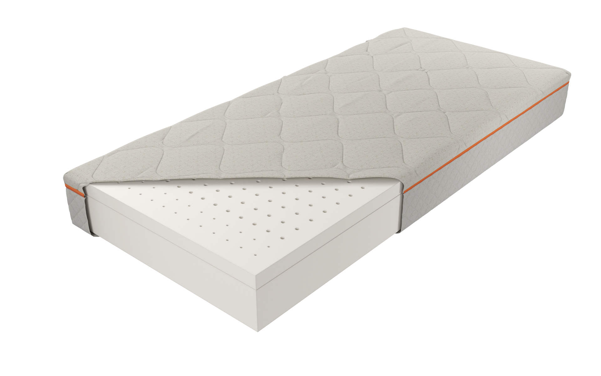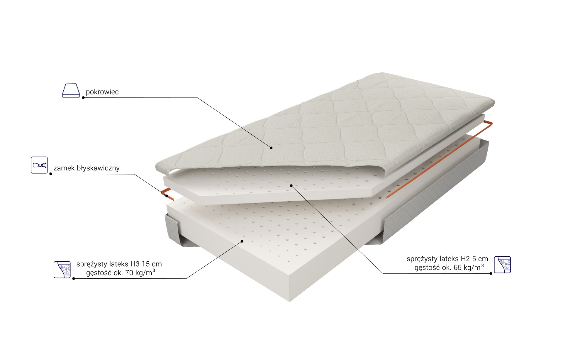 “Wkład materaca o wysokości ok. 20 cm złożony jest z 5 cm warstwy komfortowego, dopasowującego się do kształtu ciała lateksu H2 oraz 15 cm warstwy lateksu H3 zapewniającego optymalne podparcie kręgosłupa w trakcie snu i wypoczynku. Zastosowany materiał cechuje wysoka żywotność, a w codziennym użytkowaniu znakomicie sprawdzają się jego właściwości antygrzybiczne, antyroztoczowe i antybakteryjne.”