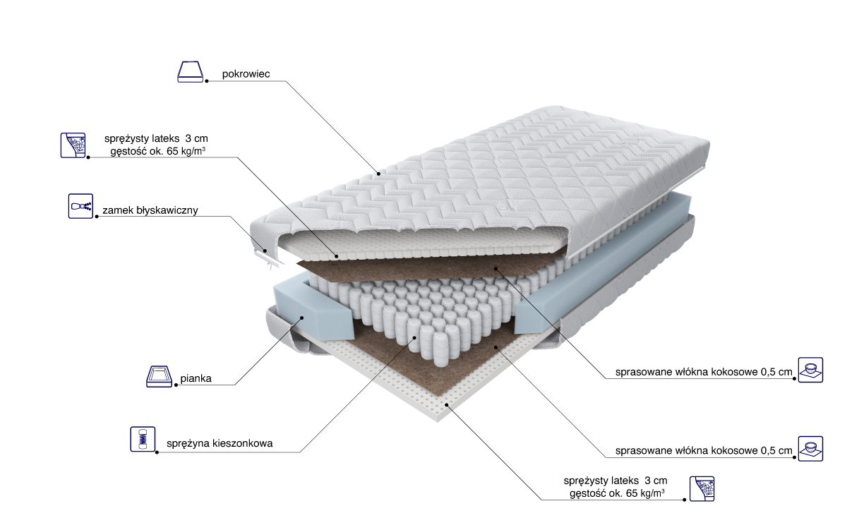 “Materac o wysokości wkładu ok. 19 cm zbudowany ze sprężyn Pocket z wysokogatunkowego drutu, umieszczonych w pojedynczych kieszonkach o średnicy 5,8 cm. Takie rozwiązanie poprawia elastyczność i zwiększa punktowe podparcie ciała. Po obu stronach materaca znajduje się 3 cm warstwa lateksu oraz 0,5 cm warstwa lateksowanej płyty kokosu, którego włókna zwiększają twardość materaca. Zastosowanie zamka błyskawicznego, który umożliwia zdjęcie i wypranie pokrowca, znacząco ułatwia utrzymanie go w czystości.”