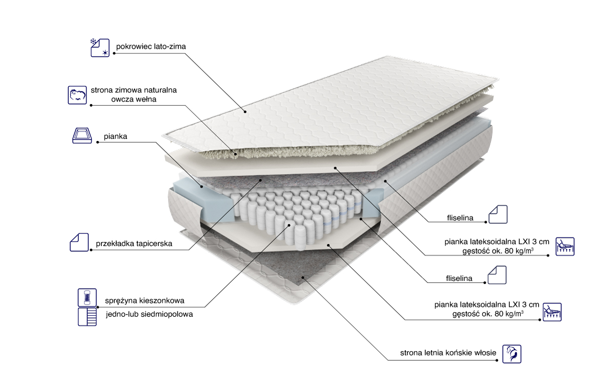 “Materac o wysokości wkładu ok. 18 cm zbudowany jest ze sprężyn Pocket z wysokogatunkowego drutu, umieszczonych w pojedynczych kieszonkach o średnicy 5,8 cm. Takie rozwiązanie poprawia elastyczność i zwiększa punktowe podparcie ciała. Po obu stronach materaca została użyta 3 cm warstwa pianki lateksoidalnej posiadającej dużą elastyczność punktową, dzięki której idealnie dopasowuje się do budowy anatomicznej użytkownika, stanowiąc optymalną podporę dla kręgosłupa. Nie gromadzi roztoczy, jest polecana dla alergików. Zastosowana po jednej stronie stronie przekładki tapicerskiej doskonale izoluje, zwiększając twardość i wytrzymałość materaca. Wykorzystanie zamka błyskawicznego, który umożliwia zdjęcie i wypranie pokrowca, znacząco ułatwia utrzymanie go w czystości. Pozbawiony możliwości zdjęcia jest pokrowiec typu lato-zima, posiadający od strony letniej owatę antyalergiczną, a od strony zimowej naturalną owczą wełnę.”