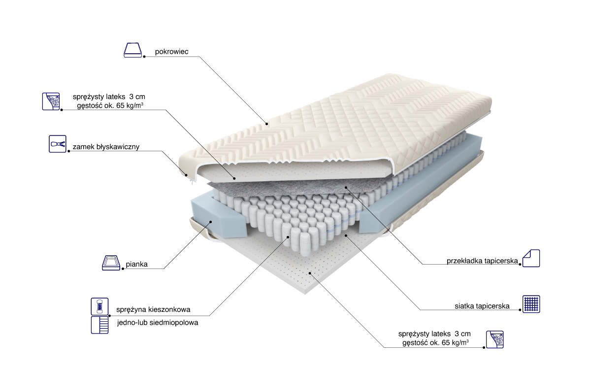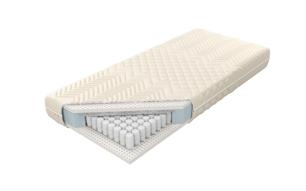 “Materac o wysokości wkładu ok. 18 cm zbudowany ze sprężyn Pocket z wysokogatunkowego drutu, umieszczonych w pojedynczych kieszonkach o średnicy 5,8 cm. Takie rozwiązanie poprawia elastyczność i zwiększa punktowe podparcie ciała. Po obu stronach materaca została użyta 3 cm warstwa lateksu o dużej gęstości, zapewniającego optymalne podparcie i komfort podczas snu. Posiada właściwości antygrzybiczne, antyroztoczowe i antybakteryjne, cechuje się długą żywotnością. Zastosowana po jednej stronie siatka tapicerska wzmacnia konstrukcję materaca, natomiast użyta po odwrotnej stronie przekładka tapicerska doskonale izoluje, podnosząc twardość i wydłużając wytrzymałość materaca. Zastosowanie zamka błyskawicznego, który umożliwia zdjęcie i wypranie pokrowca, znacząco ułatwia utrzymanie go w czystości. Pozbawiony możliwości zdjęcia jest pokrowiec typu lato-zima, posiadający od strony letniej owatę antyalergiczną, a od strony zimowej naturalną owczą wełnę.”