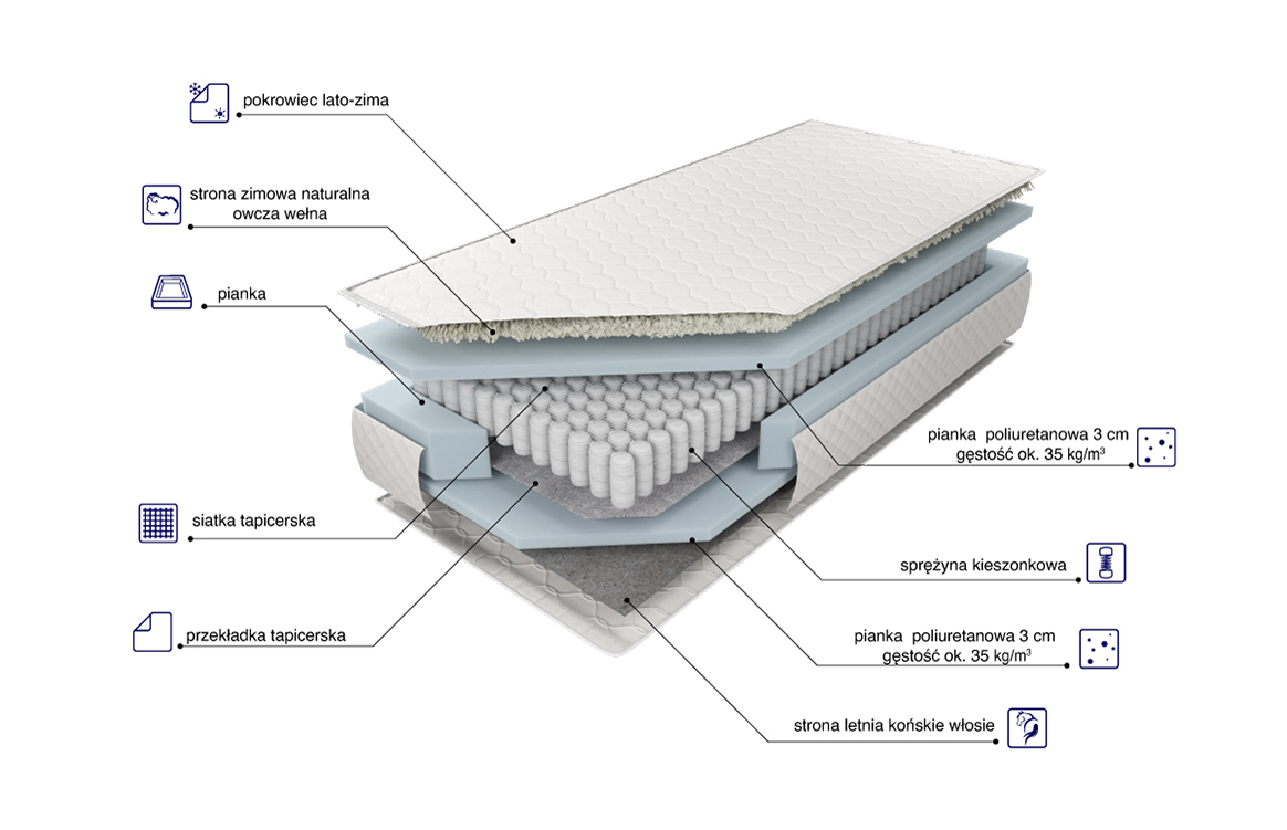 “Materac o wysokości wkładu ok. 18 cm zbudowany jest ze sprężyn z wysokogatunkowego drutu, umieszczonych w pojedynczych kieszonkach o średnicy 5,8 cm. Takie rozwiązanie poprawia elastyczność i zwiększa punktowe podparcie ciała. Po obu stronach materaca została użyta 3 cm warstwa pianki poliuretanowej charakteryzującej się wysoką trwałością. Zastosowana po jednej stronie przekładka tapicerska doskonale izoluje wkład piankowy od sprężynowego, zwiększając wytrzymałość materaca i wydłużając jego żywotność, natomiast użyta po odwrotnej stronie siatka tapicerska wzmacnia konstrukcję materaca i wspomaga jego wentylację. Utrzymanie pokrowca w czystości ułatwia zastosowanie w nim zamka błyskawicznego, który umożliwia zdjęcie z materaca i wypranie. Pozbawiony możliwości zdjęcia jest pokrowiec typu lato-zima, posiadający od strony letniej owatę antyalergiczną oraz lateksowane włosie końskie, które ma za zadanie pochłaniać i odprowadzać wilgoć z materaca, a od strony zimowej naturalną owczą wełnę.”
