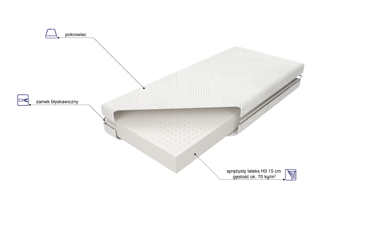 “Wkład materaca o wysokości ok. 15 cm złożony jest z warstwy komfortowego, dopasowującego się do kształtu ciała i dającego optymalne podparcie dla kręgosłupa lateksu H3. Zastosowany materiał cechuje wysoka żywotność, a w codziennym użytkowaniu znakomicie sprawdzają się jego właściwości antygrzybiczne, antyroztoczowe i antybakteryjne. Zastosowanie zamka błyskawicznego, który umożliwia zdjęcie i wypranie pokrowca, znacząco ułatwia utrzymanie go w czystości.”