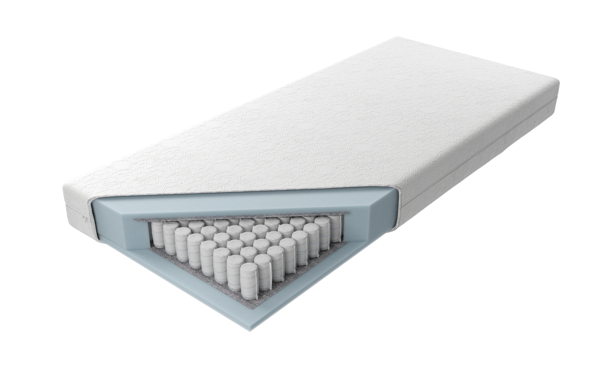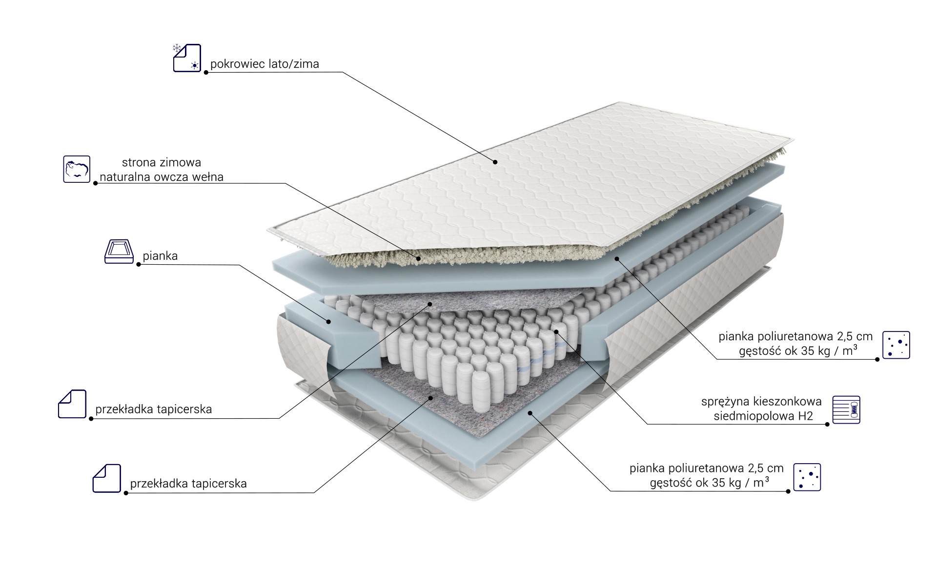 “Materac o wysokości ok. 17 cm zbudowany ze sprężyn siedmiopolowych Pocket z wysokogatunkowego drutu o twardości H2, umieszczonych w pojedynczych kieszonkach o średnicy 5,8 cm, zwiększających elastyczność oraz punktowe podparcie dla kręgosłupa. Siedem stref twardości utrzymuje poszczególne części ciała. Z obu stron użyta została 2,5 cm warstwa wytrzymałej, nie odkształcającej się, pianki poliuretanowej. Zastosowana obustronnie przekładka tapicerska doskonale izoluje, zwiększając twardość i wydłużając żywotność materaca. Wykorzystanie zamka błyskawicznego, który umożliwia zdjęcie i wypranie pokrowca, znacząco ułatwia utrzymanie go w czystości. Brak możliwości zdjęcia pokrowca typu lato-zima. Posiada od strony letniej owatę antyalergiczną, a od strony zimowej naturalną owczą wełnę.”