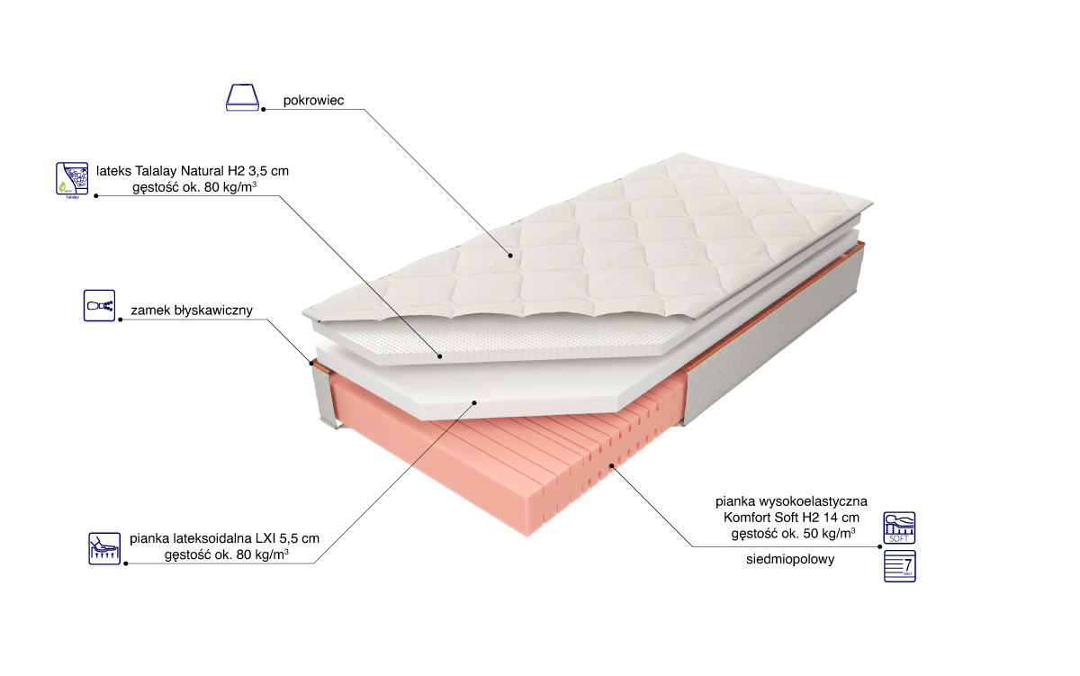 “Wkład materaca zbudowany jest z trzech połączonych ze sobą warstw: górnej, którą stanowi 3,5 cm 100% naturalnego lateksu Talalay, o właściwościach antybakteryjnych i antygrzybicznych. Idealnie dopasowuję się do ciała, zapewniając optymalne podparcie i wygodę. Twardość: średnio twardy (TH2) Środkową warstwę stanowi 5,5 cm pianki lateksoidalnej. Dolna warstwa, czyli 14 cm wysokoelastycznej, konturowo wyciętej pianki, którą charakteryzuje wysoka trwałość. Poprzeczne kanały w piance zwiększają wentylację wewnętrzną materaca. Twardość H2. W utrzymaniu wysokiego poziomu higieny pomaga zastosowanie zamka błyskawicznego, pozwalającego na zdjęcie i wypranie pokrowca.”