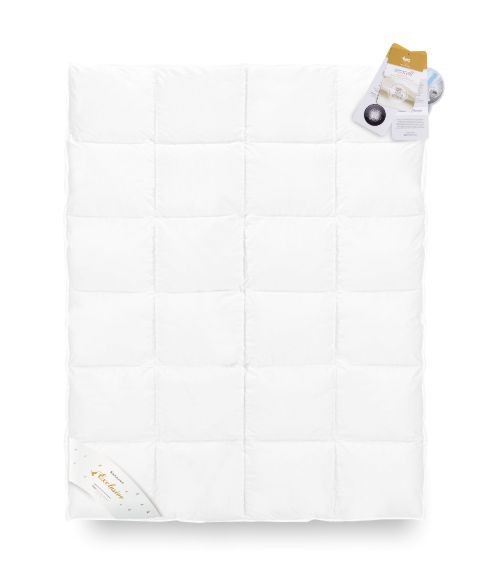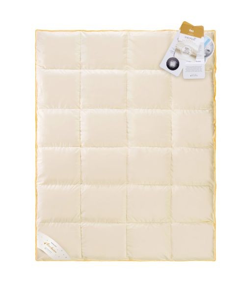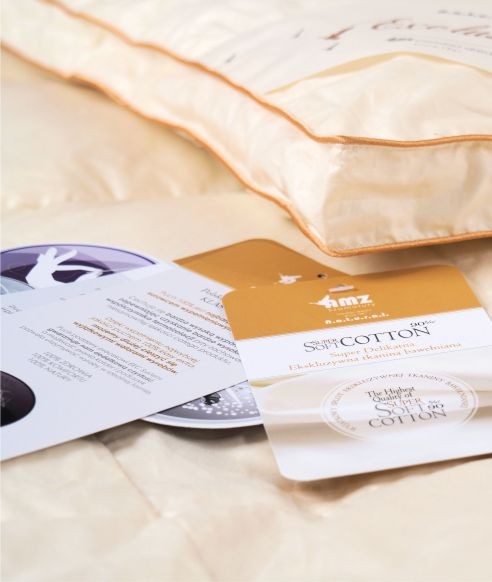 Kołdra o budowie materacowej – szyta w technologii ciepłego szwu z wysokimi ściankami zewnętrznymi (rant boczny) zapewnia najlepsze właściwości termoizolacyjne. Kratki są szczelnie zamknięte, uniemożliwiając przemieszczanie się wypełniania pomiędzy komorami. Białe wyroby wykończone są białą bizą, kremowe bizą koloru złotego.