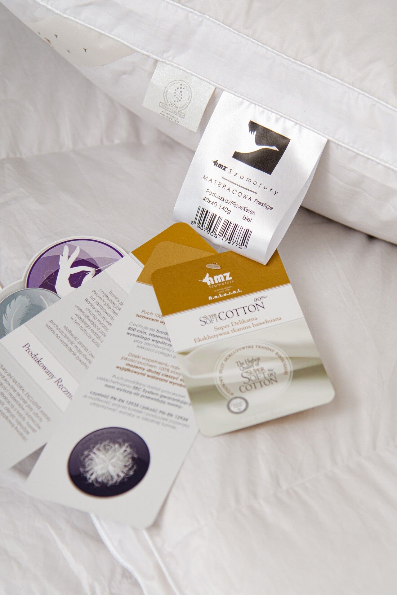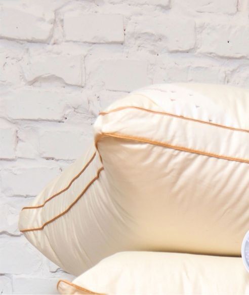 - Poduszka jest wysoka dzięki materacowej konstrukcji oraz większej ilości wypełnienia. Białe wyroby posiadają bize białą, kremowe bize koloru złotego.