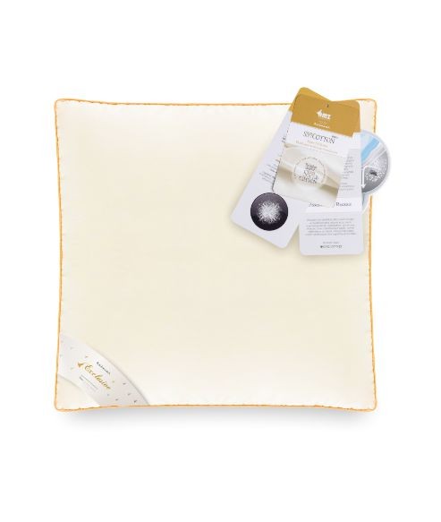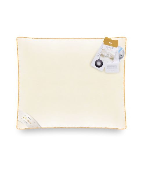 • Poduszka jest wysoka dzięki materacowej konstrukcji oraz większej ilości wypełnienia. Białe wyroby posiadają bize białą, kremowe bize koloru złotego.