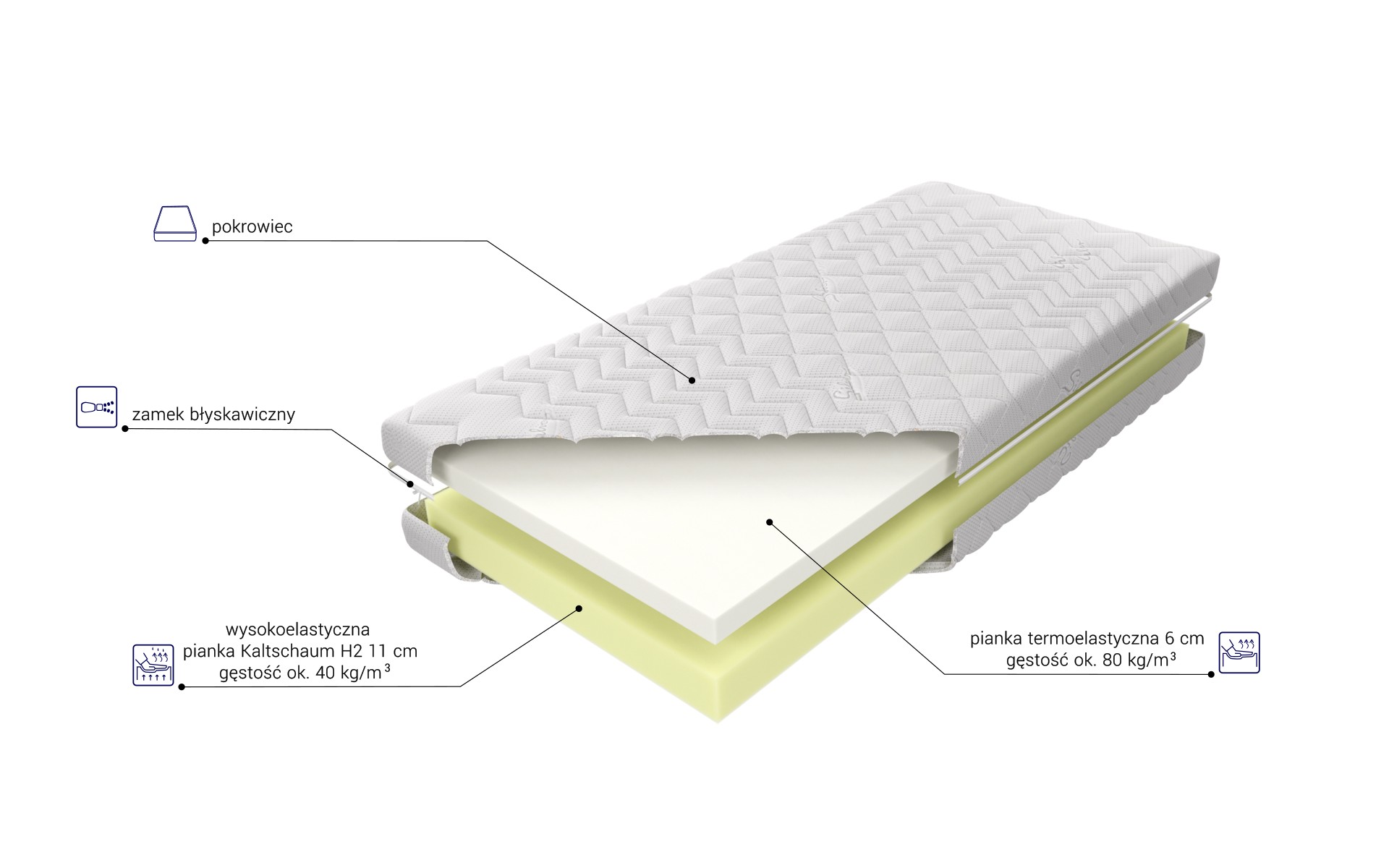 “Materac o wysokości ok. 19 cm (w zależności od pokrowca) zbudowany jest z 11 cm warstwy wysokoelastycznej pianki Kaltschaum, cechującej się zwiększoną sprężystością, dającej możliwość optymalnej ergonomii i podparcia ciała, połączonej z 6 cm warstwą pianki termoelastycznej, która pod wpływem temperatury idealnie dopasowuje się do kształtu ciała, by zapewnić wyjątkowy komfort snu. Istnieje możliwość wyboru poziomu twardości materaca. Utrzymanie wysokiego poziomu czystości zapewnia zamek błyskawiczny umożliwiający zdjęcie pokrowca. Niektóre pokrowce pikowane są 200g / m2, upewnij się u sprzedawcy przed zakupem, jaką gramaturę ma wybrany pokrowiec.”