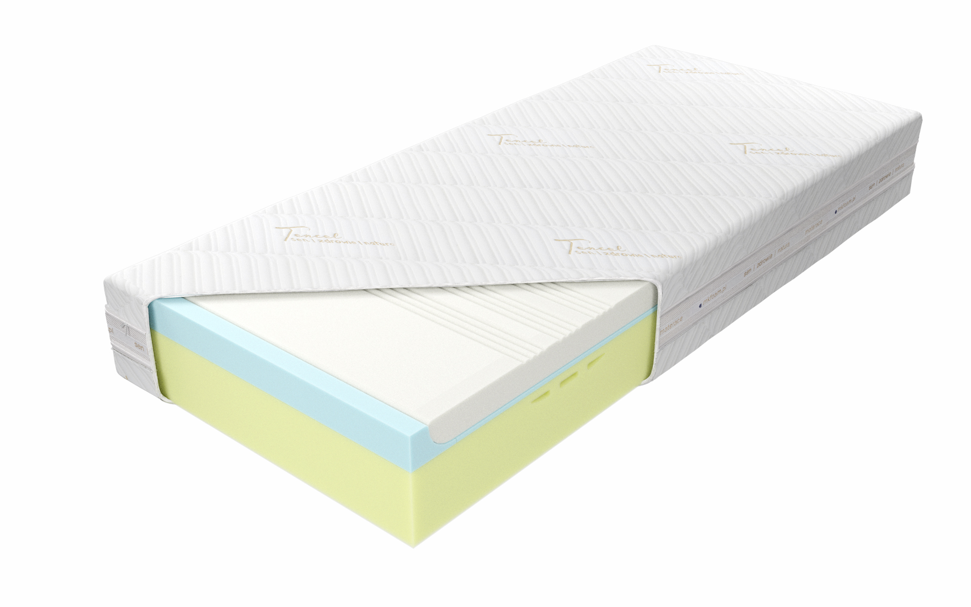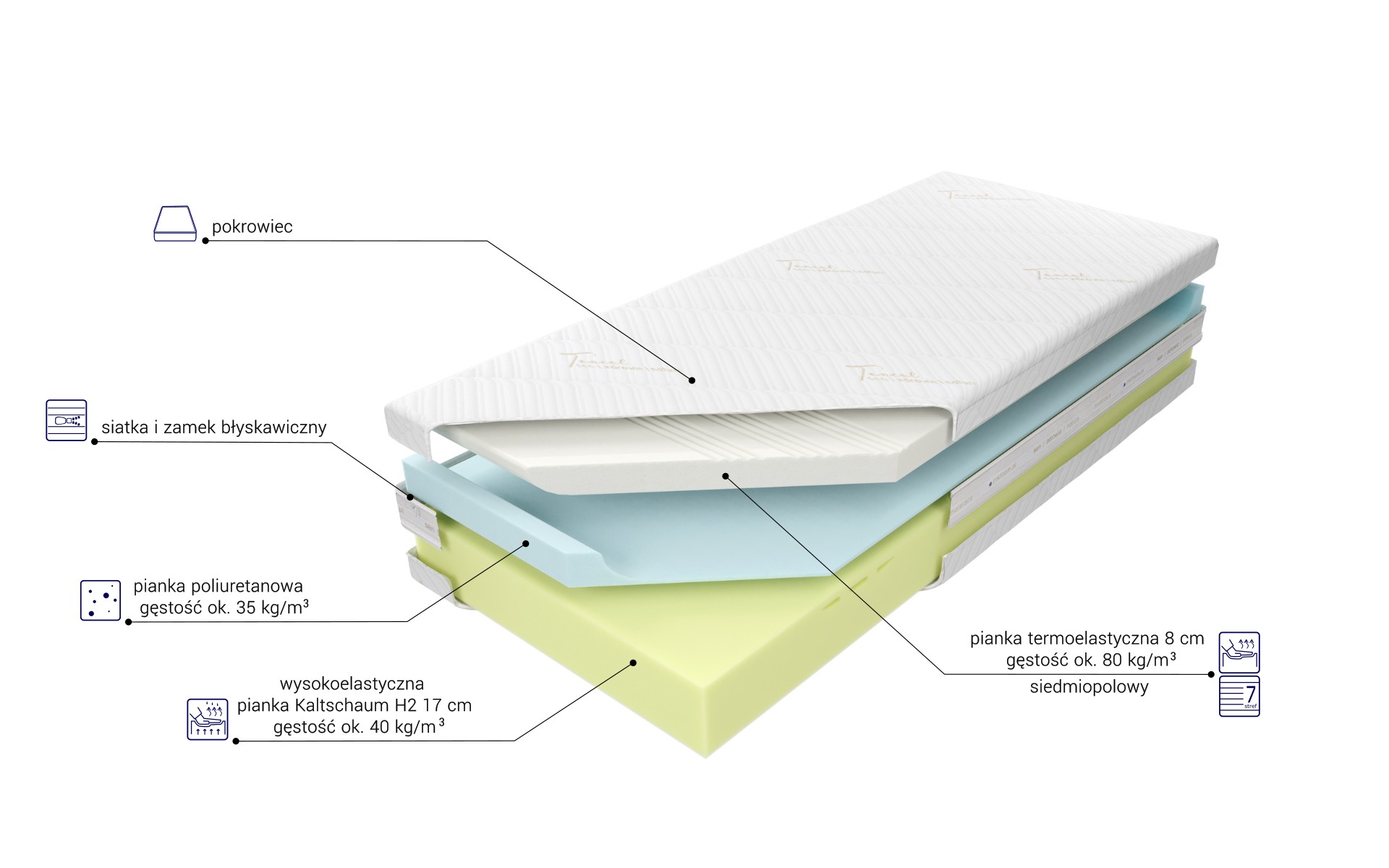“Materac o wysokości ok. 26 cm (w zależności od pokrowca) zbudowany jest z 17 cm warstwy wysokoelastycznej pianki Kaltschaum, cechującej się zwiększoną sprężystością, dającej możliwość optymalnej ergonomii i podparcia ciała, połączonej z 7 cm warstwą pianki termoelastycznej o dużej gęstości, która pod wpływem temperatury idealnie dopasowuje się do kształtu ciała. Pianka ta reaguje na temperaturę i ciężar ciała, jest antybakteryjna i nie pozwala na rozwój roztoczy. Staje się bardziej miękka w miejscu, gdzie ciało się styka z powierzchnią materaca. Materac posiada siedem stref twardości utrzymujących poszczególne części ciała w położeniu dopasowanym do budowy anatomicznej. Utrzymanie wysokiego poziomu czystości zapewnia zamek błyskawiczny umożliwiający zdjęcie pokrowca.”