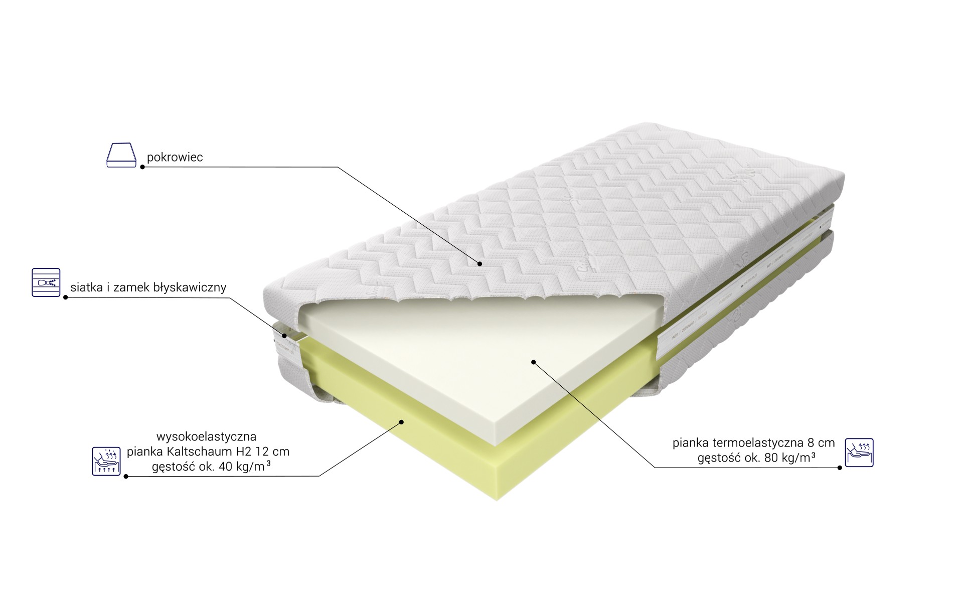“Materac o wysokości ok. 21 cm (w zależności od pokrowca) zbudowany jest z 12 cm warstwy wysokoelastycznej pianki Kaltschaum, cechującej się zwiększoną sprężystością, dającej możliwość optymalnej ergonomii i podparcia ciała, połączonej z 8 cm warstwą pianki termoelastycznej o dużej gęstości, która pod wpływem temperatury idealnie dopasowuje się do kształtu ciała. Pianka ta reaguje na temperaturę i ciężar ciała, jest antybakteryjna i nie pozwala na rozwój roztoczy. Staje się bardziej miękka w miejscu, gdzie ciało się styka z powierzchnią materaca. Utrzymanie wysokiego poziomu czystości zapewnia zamek błyskawiczny umożliwiający zdjęcie pokrowca.”