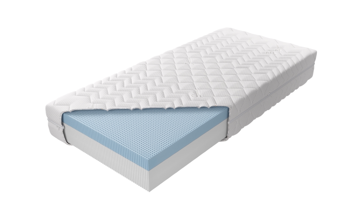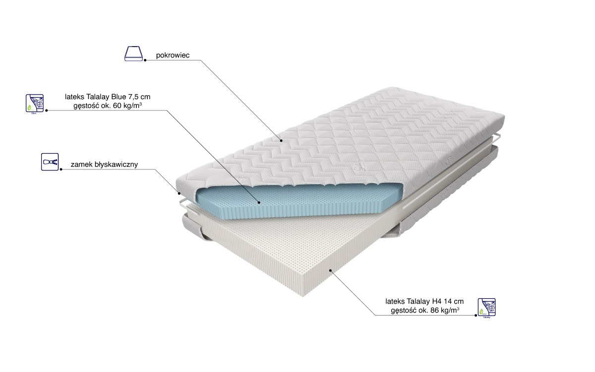 “Materac z wkładem o wysokości ok. 21,5 cm posiada dwie warstwy lateksu. Pierwsza warstwa składa się z 7,5 cm warstwy lateksu Talalay Blue, posiadającego umiejętność utrzymania równowagi cieplnej. Odpowiednio oddaje lub pobiera energię ciała ciała w zależności od wahań temperatury, eliminując problem z potliwością. Otwartokomórkowa struktura podnosi poziom cyrkulacji powietrza, zapewnia optymalne podparcie i komfort. Z kolei 14 cm warstwa naturalnego lateksu Talalay Natural H4, którego otwartokomórkowa struktura przyczynia się do doskonałej wentylacji i cyrkulacji powietrza, zapewnia komfort i optymalne podparcie śpiącego. Materac posiada dodatkowy pokrowiec wewnętrzny, zapewniający większą ochronę wkładu. Zastosowanie zamka błyskawicznego, który umożliwia zdjęcie i wypranie pokrowca zewnętrznego, znacząco ułatwia utrzymanie go w czystości.”