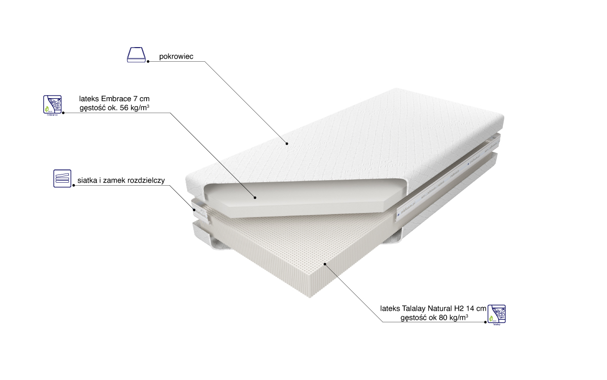 “Wkład materaca o wysokości ok. 21 cm posiada 2 warstwy lateksu. Pierwsza warstwa składa się z 7 cm warstwy niezwykle elastycznego lateksu Talalay Embrace, łączącego zalety lateksu Talalay i pianki termoelastycznej. Posiada właściwości regulujące temperaturę, idealnie dopasowuje się i amortyzuje ciało w spoczynku. Wysoka cyrkulacja powietrza wynika z otwartokomórkowej struktury. Z kolei 14 cm warstwa lateksu Talalay Natural H2, którego budowa przyczynia się do doskonałej wentylacji, zapewnia komfort i optymalne podparcie śpiącego. Materac posiada dodatkowy pokrowiec wewnętrzny, zapewniający większą ochronę wkładu. Zastosowanie zamka błyskawicznego, który umożliwia zdjęcie i wypranie pokrowca zewnętrznego, znacząco ułatwia utrzymanie go w czystości.”