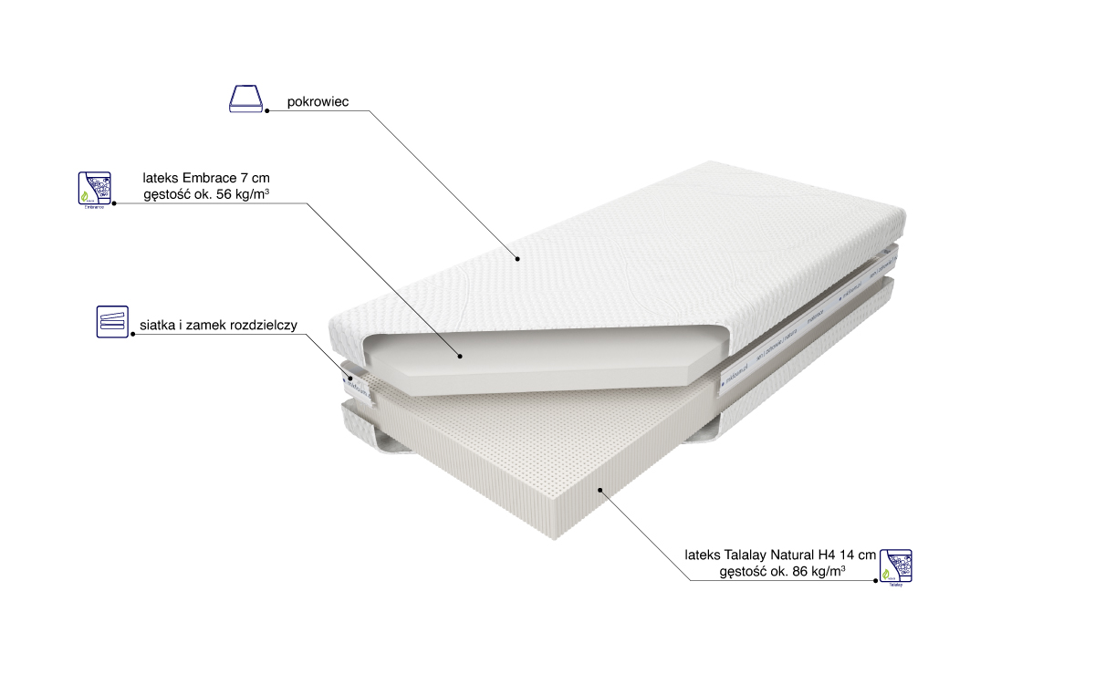 “Wkład materaca o wysokości ok. 21 cm posiada 2 warstwy lateksu. Pierwsza warstwa składa się z 7 cm warstwy niezwykle elastycznego lateksu Talalay Embrace, łączącego zalety Talalay i pianki termoelastycznej. Posiada właściwości regulujące temperaturę, idealnie dopasowuje się i amortyzuje ciało w spoczynku. Wysoka cyrkulacja powietrza wynika z otwartokomórkowej struktury. Z kolei 14 cm warstwa lateksu Talalay H4, produkowanego na bazie naturalnego mleczka kauczukowego z domieszką lateksu syntetycznego, o otwartokomórkowej strukturze sprzyjającej wentylacji i cyrkulacji powietrza, zapewnia odpowiednie podparcie ciała śpiącego. Materac polecany jest użytkownikom o dużej wadze.”