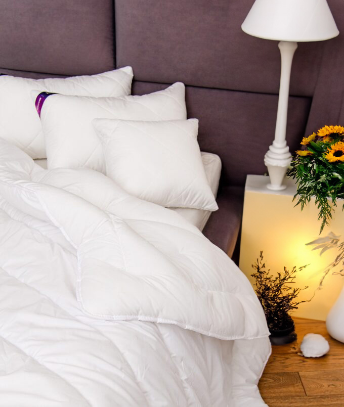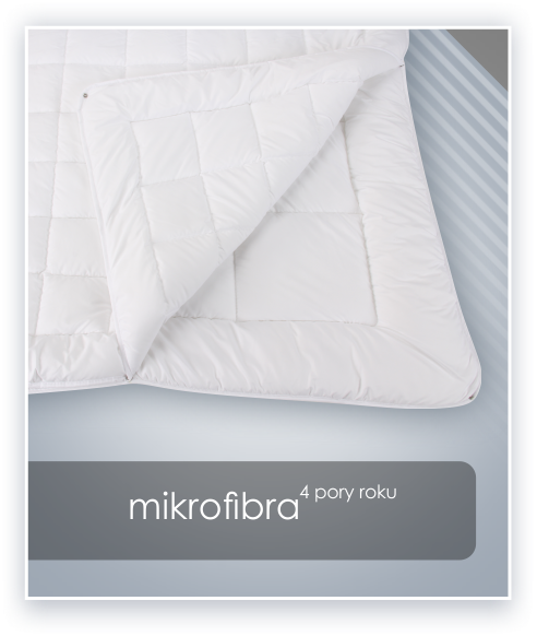 Kołdra typu 4 PORY ROKU. Są to dwie spinane ze sobą kołdry, z których jedna jest kołdrą letnią, a druga to kołdra całoroczna – po ich spięciu napami otrzymujemy bardzo ciepłą kołdrę zimową. Wypełniona materiałem DreamFill z drobnych spiralnie skręconych włókien poliestrowych pokrytych silikonem, dzięki czemu są bardziej puszyste oraz dłużej zachowują swój pierwotny kształt. Włókno posiada bardzo dobry współczynnik termoizolacji, zapewniając ciepło przy zachowaniu niskiej wagi wyrobu. Optymalna cyrkulacja powietrza pozwala ciału oddychać i optymalizować temperaturę podczas snu. Zastosowany materiał pokryciowy ma wyjątkowe właściwości – jego włókno jest wielokrotnie cieńsze od jedwabiu, dzięki czemu tkanina jest bardzo gładka, delikatna i trwała. Mikrofibra to tkanina oddychająca, doskonale filtruje powietrze i nie pozwala na przegrzanie organizmu. Wierzch materiału pokrywa przyjemny w dotyku delikatny meszek, utrzymujący wyroby we właściwym miejscu w poszewce. Certyfikowany produkt medyczny.