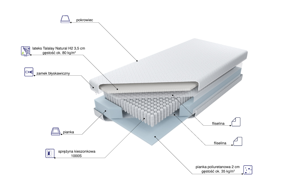 “Wkład materaca o wysokości ok. 18,5 cm zbudowany ze sprężyn 1000S z wysokogatunkowego drutu, umieszczonych w pojedynczych kieszonkach o średnicy 39 mm. Z jednej strony materaca znajduje się 3,5 cm warstwa naturalnego lateksu Talalay o twardości H2, produkowanego na bazie naturalnego mleczka kauczukowego, o otwartokomórkowej strukturze sprzyjającej doskonałej wentylacji i cyrkulacji powietrza. Zapewnia optymalne podparcie wpływające na komfort wypoczynku. Z drugiej strony użyta została 2 cm warstwa wytrzymałej, nie odkształcającej się, pianki poliuretanowej. Wykorzystanie zamka błyskawicznego, który umożliwia zdjęcie i wypranie pokrowca, znacząco ułatwia utrzymanie go w czystości.”