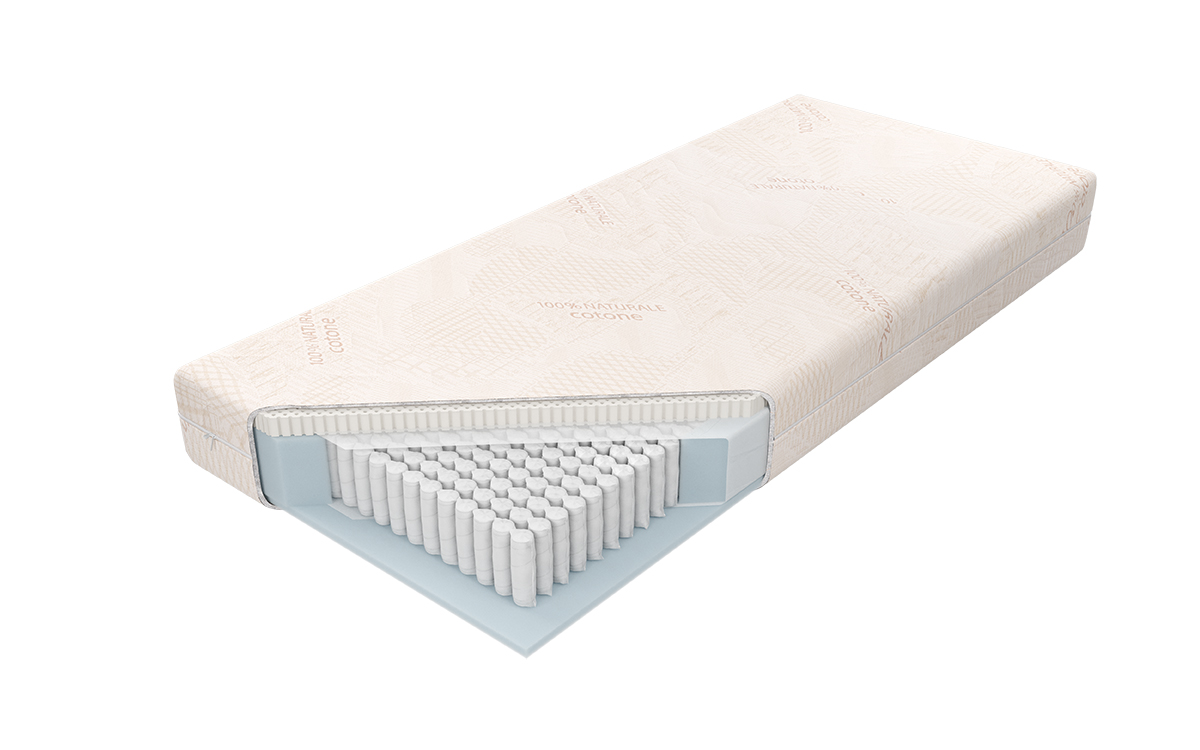 “Wkład materaca o wysokości ok. 18,5 cm zbudowany ze sprężyn 1000S, z wysokogatunkowego drutu o twardości H3, umieszczonych w pojedynczych kieszonkach o średnicy 39 mm. Z jednej strony materaca znajduje się 3,5 cm warstwa naturalnego lateksu Talalay o twardości H3, produkowanego na bazie naturalnego mleczka kauczukowego, o otwartokomórkowej strukturze sprzyjającej doskonałej wentylacji i cyrkulacji powietrza. Zapewnia optymalne podparcie wpływające na komfort wypoczynku. Z drugiej strony użyta została 2 cm warstwa wytrzymałej, nie odkształcającej się, pianki poliuretanowej. Wykorzystanie zamka błyskawicznego, który umożliwia zdjęcie i wypranie pokrowca, znacząco ułatwia utrzymanie go w czystości.”