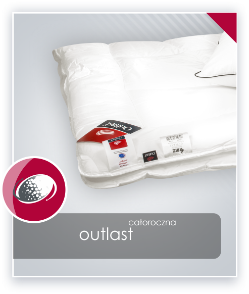Termoaktywna kołdra całoroczna wypełniona włóknem OUTLAST. To zaawansowane technologicznie rozwiązanie tworzy korzystny mikroklimat, zapobiegając przegrzewaniu się i poceniu – ograniczając tym samym warunki do rozwoju drobnoustrojów. Włókno OUTLAST stworzone zostało pierwotnie na potrzeby kombinezonów kosmicznych NASA. Doceniono jego zdolność do optymalizacji temperatury organizmu podczas snu – zależnie od potrzeb może chłodzić, grzać lub być neutralne. Jako pokrycie kołdry zastosowano najwyższej jakości bawełnianą tkaninę o splocie batystowym, która zapewnia miękkość i delikatność. Materiały użyte do produkcji posiadają certyfikat Oeko-Tex. Kołdra jest bezpieczna dla alergików i zapewnia komfortowe warunki do snu – w idealnie dostosowanych warunkach termicznych.