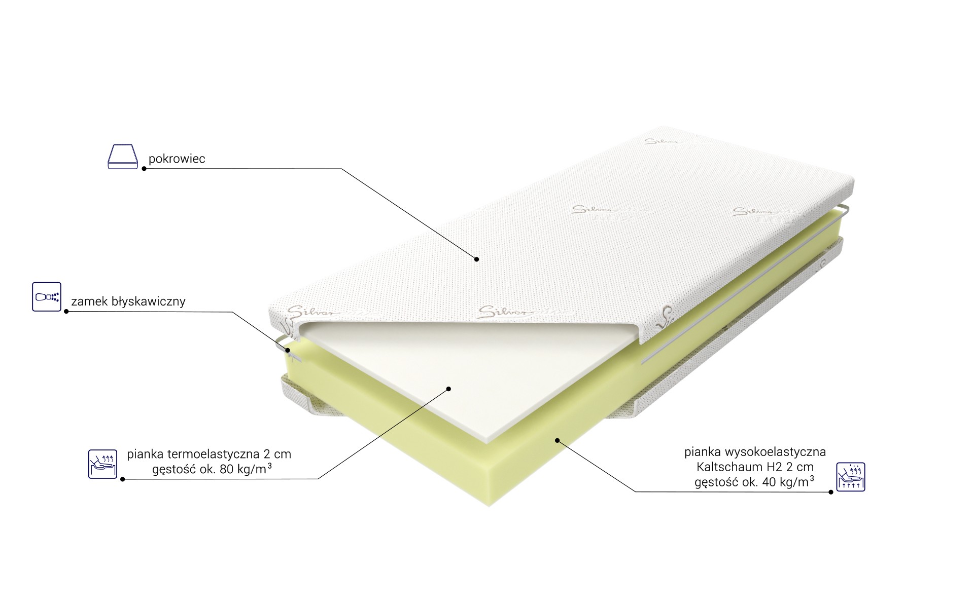 “Materac o wysokości ok. 16 cm (w zależności od pokrowca) zbudowany jest z 12 cm warstwy wysokoelastycznej pianki Kaltschaum, cechującej się zwiększoną sprężystością, dającej możliwość optymalnej ergonomii i podparcia ciała, połączonej z 2 cm warstwą pianki termoelastycznej o dużej gęstości, która pod wpływem temperatury idealnie dopasowuje się do kształtu ciała.Pianka ta reaguje na temperaturę i ciężar ciała, jest antybakteryjna i nie pozwala na rozwój roztoczy. Staje się bardziej miękka w miejscu, gdzie ciało się styka z powierzchnią materaca. Istnieje możliwość wyboru poziomu twardości materaca. Utrzymanie wysokiego poziomu czystości zapewnia zamek błyskawiczny umożliwiający zdjęcie pokrowca.”