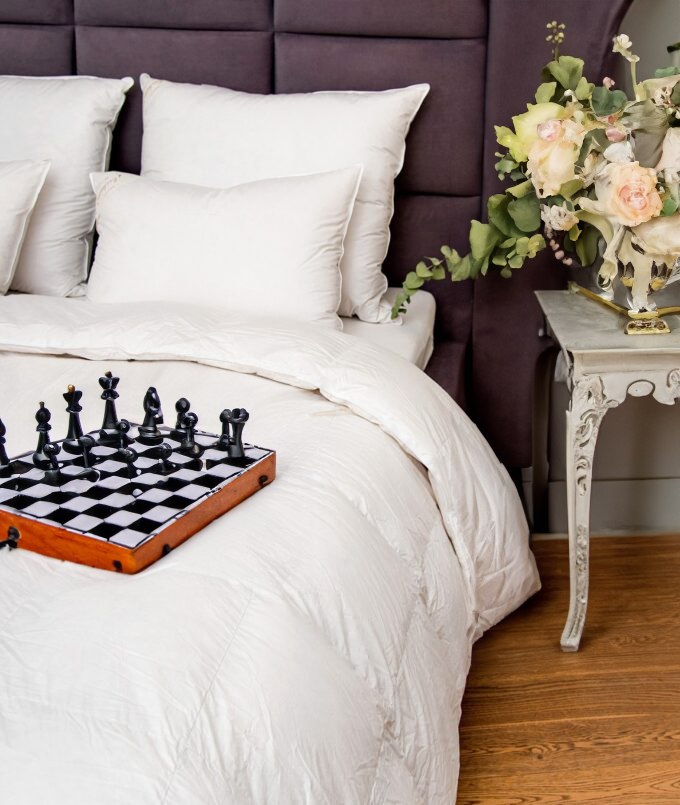 • Wypełnienie: Komory zewnętrzne – 100% polski gęsi puch, komora wewnętrzna – puch 70%.