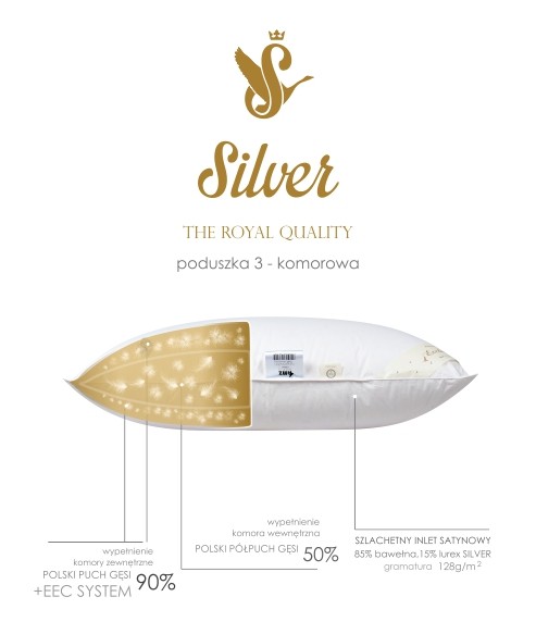 Puszysta, wysoka poduszka z antybakteryjnymi właściwościami. Wypełniona 90% polskim gęsim puchem o wyporności 700 cuin. Pozostałe 10% to miękkie, drobne piórka puchowe. Użyty puch jest surowcem bardzo wysokiej jakości, posiadającym świetną wyporność. Poduszka jest produkowana ręcznie, z dbałością o najmniejszy detal.