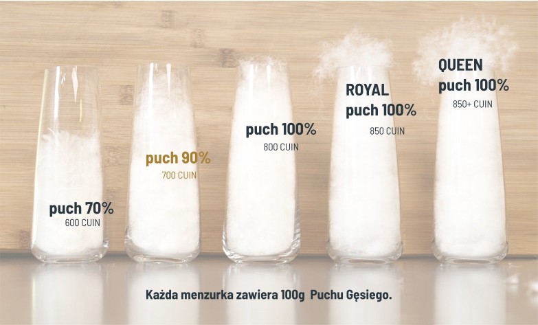 • Wypełnienie: naturalne – 90% polski gęsi puch o wyporności 700 cuin oraz 10% miękkich, drobnych piórek puchowych; w komorze wewnętrznej: puch gęsi 50%.