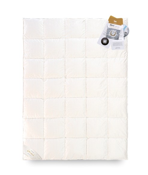 Kasetonowa konstrukcja. Kratki są szczelnie zamknięte, dzięki czemu puch pozostaje na swoim miejscu i jest równomiernie rozłożony. Kołdra szyta w technologii ciepłego szwu, co zapewnia lepsze właściwości termoizolacyjne. Wykończona bizą w srebrnym kolorze.