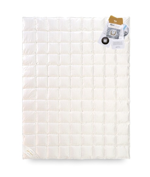 Kołdra szyta metodą tradycyjną, w technologii zimnego szwu. Kratki są szczelnie zamknięte, dzięki czemu puch pozostaje na swoim miejscu i jest równomiernie rozłożony. Kratki są szczelnie zamknięte, dzięki czemu puch pozostaje na swoim miejscu i jest równomiernie rozłożony. Wykończona bizą w srebrnym kolorze. Produkt posiada atest PZH wydany przez Narodowy Instytut Zdrowia Publicznego.