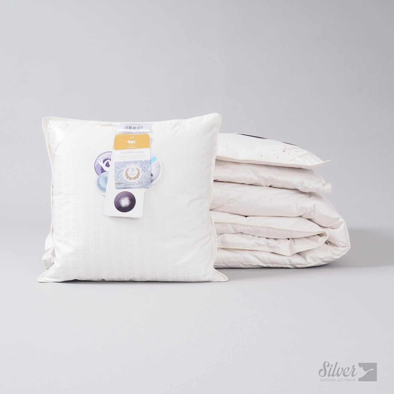 - Pokrycie: delikatna tkanina – 85% bawełnianej satyny i 15% materiału lurex SILVER, o właściwościach antybakteryjnych i antyzapachowych