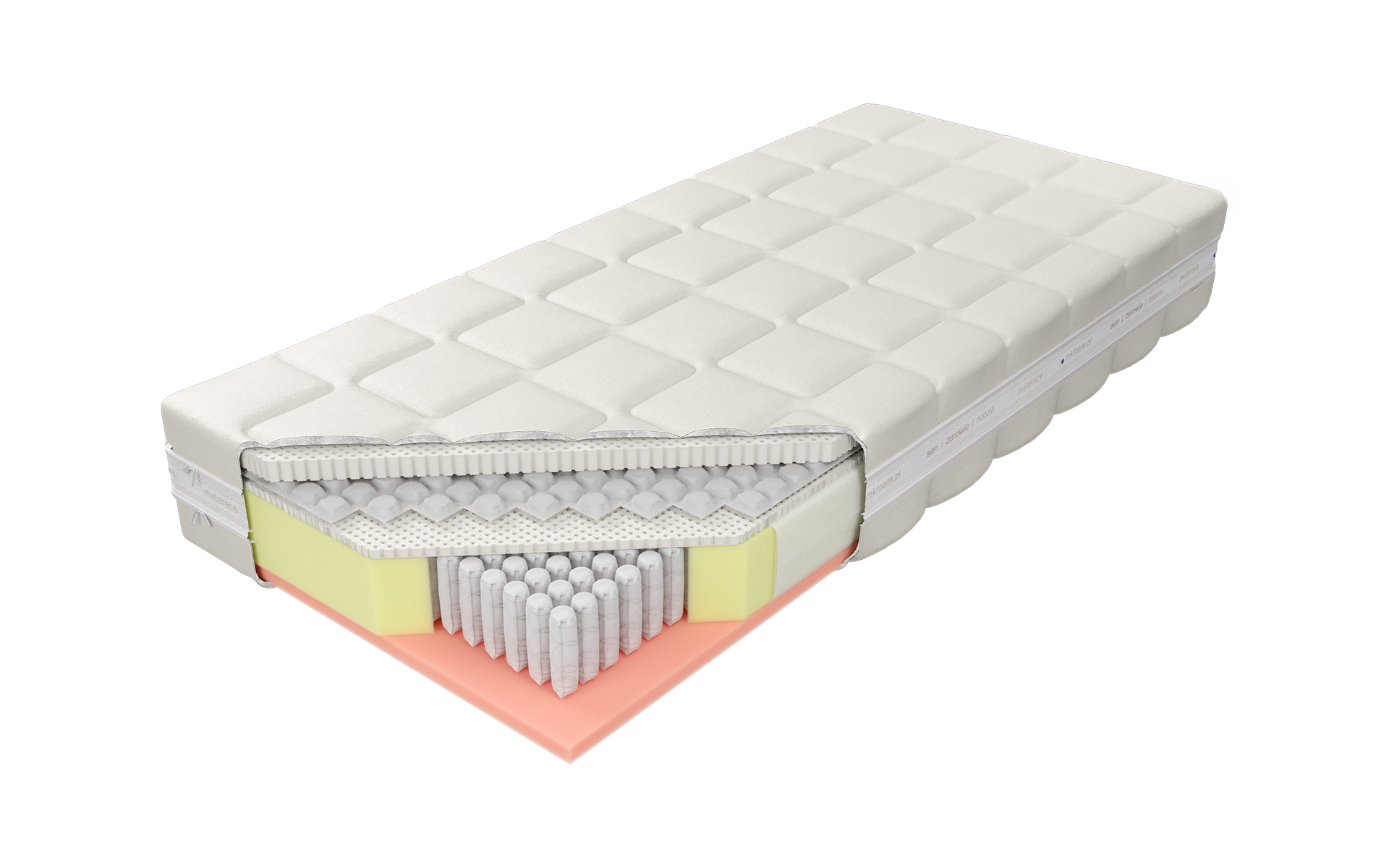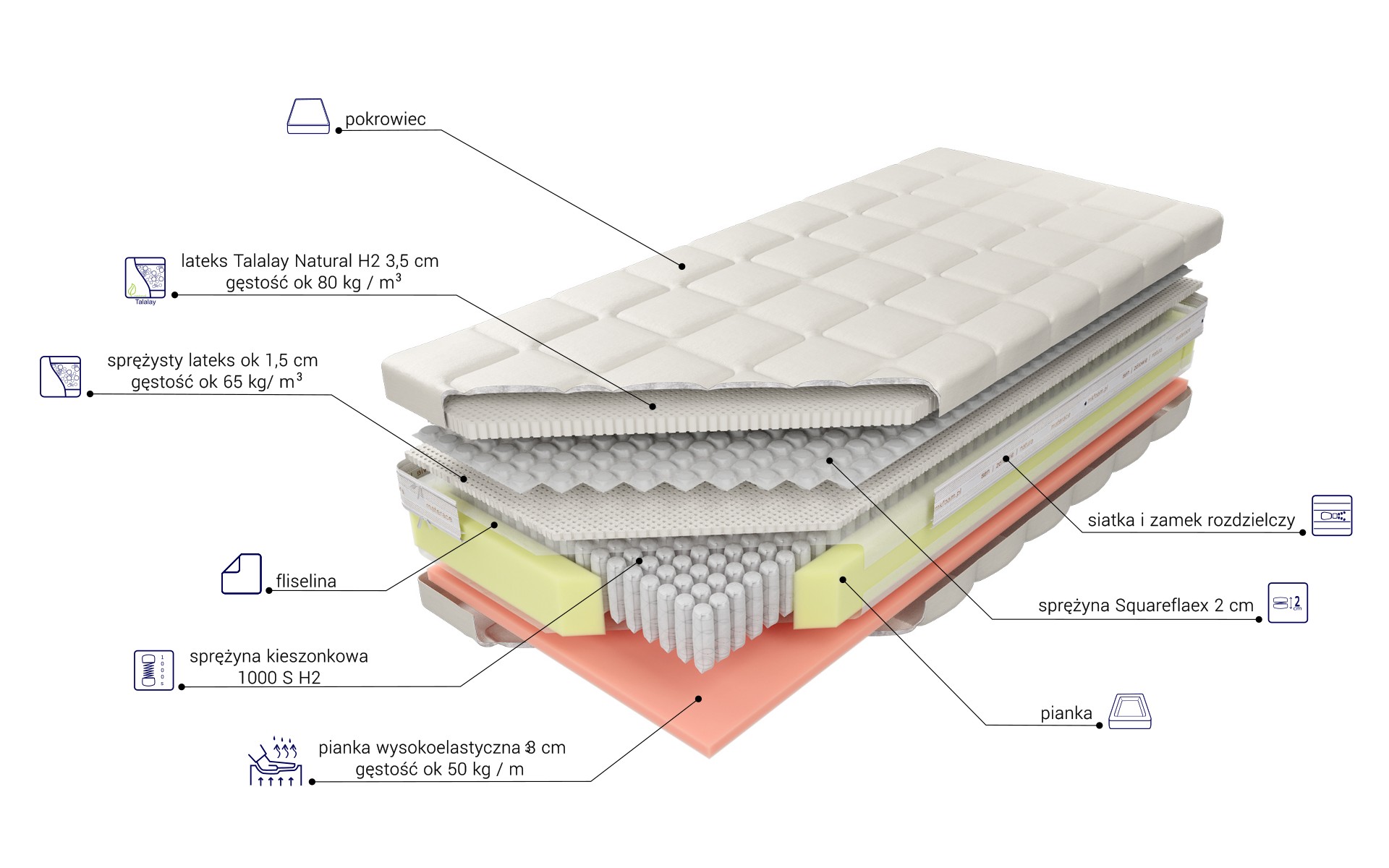 “Osiągnij wyjątkowy komfort snu dzięki materacowi zbudowanemu z najwyższej jakości komponentów. Górną warstwę stanowią dwa płaty naturalnego lateksu Talalay, oddzielone mini sprężyną Squareflex, co zapewnia doskonałą elastyczność i wsparcie dla ciała. Rdzeń materaca składa się z wysokogatunkowych sprężyn 1000 S, umieszczonych w pojedynczych kieszonkach o średnicy 3,9 cm. Dzięki dużej liczbie sprężyn, materac gwarantuje znakomite punktowe podparcie i elastyczność. Dolna warstwa to wysokoelastyczna pianka Komfort Soft o gęstości około 50 kg/m. Zastosowanie zamka błyskawicznego, który umożliwia zdjęcie i wypranie pokrowca, znacząco ułatwia utrzymanie go w czystości.”