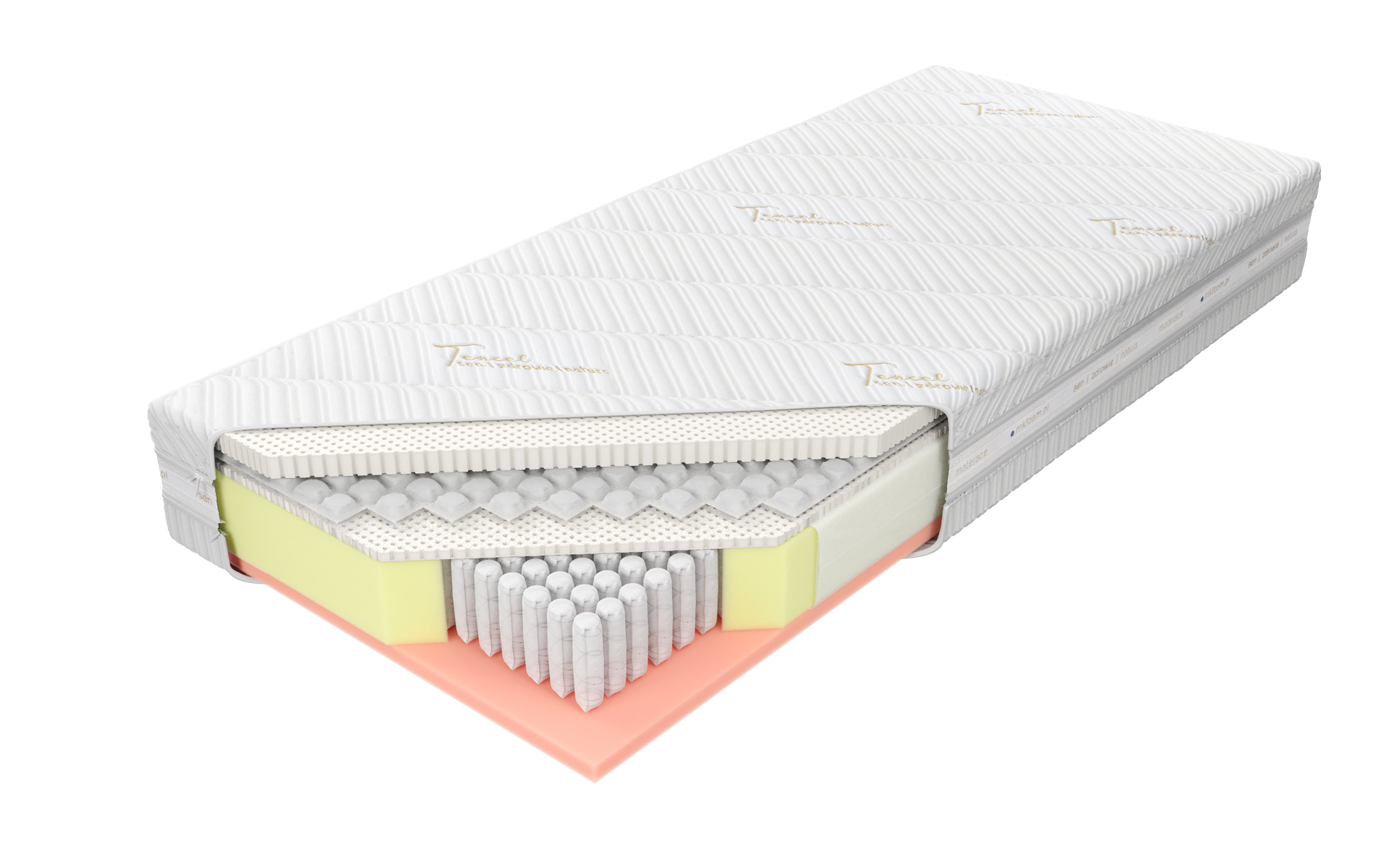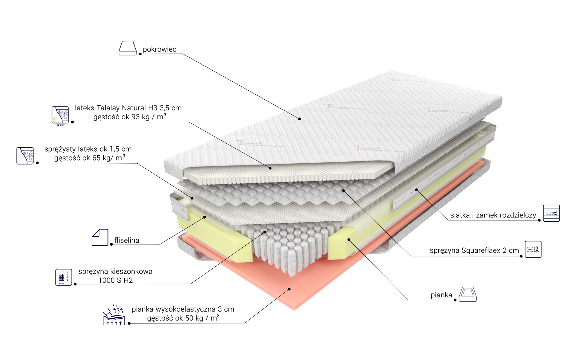 “Osiągnij wyjątkowy komfort snu dzięki materacowi zbudowanemu z najwyższej jakości komponentów. Górną warstwę stanowią dwa płaty naturalnego lateksu Talalay, oddzielone mini sprężyną Squareflex, co zapewnia doskonałą elastyczność i wsparcie dla ciała. Rdzeń materaca składa się z wysokogatunkowych sprężyn 1000 S, umieszczonych w pojedynczych kieszonkach o średnicy 3,9 cm. Dzięki dużej liczbie sprężyn, materac gwarantuje znakomite punktowe podparcie i elastyczność. Dolna warstwa to wysokoelastyczna pianka Komfort Soft o gęstości około 50 kg/m. Zastosowanie zamka błyskawicznego, który umożliwia zdjęcie i wypranie pokrowca, znacząco ułatwia utrzymanie go w czystości.”