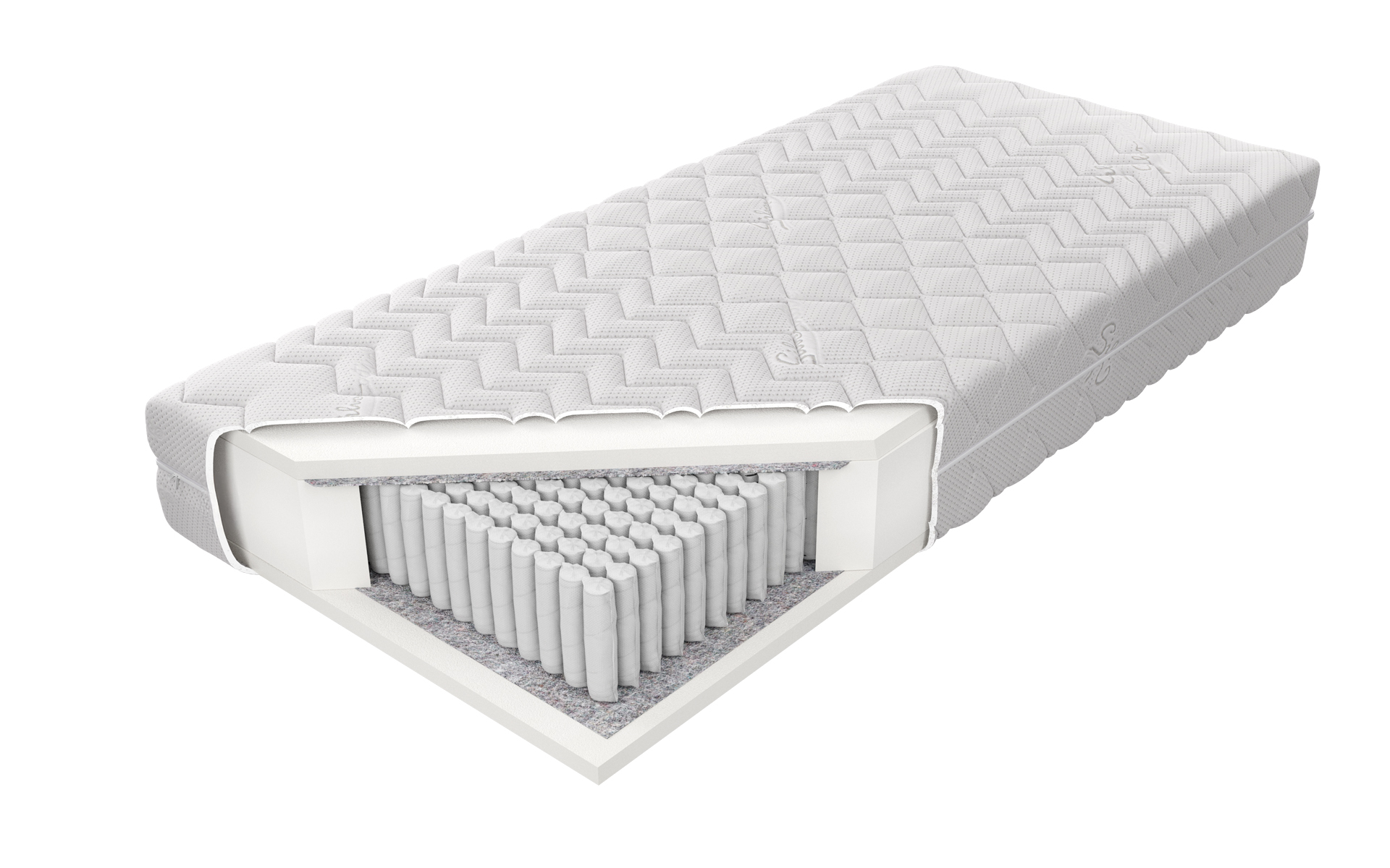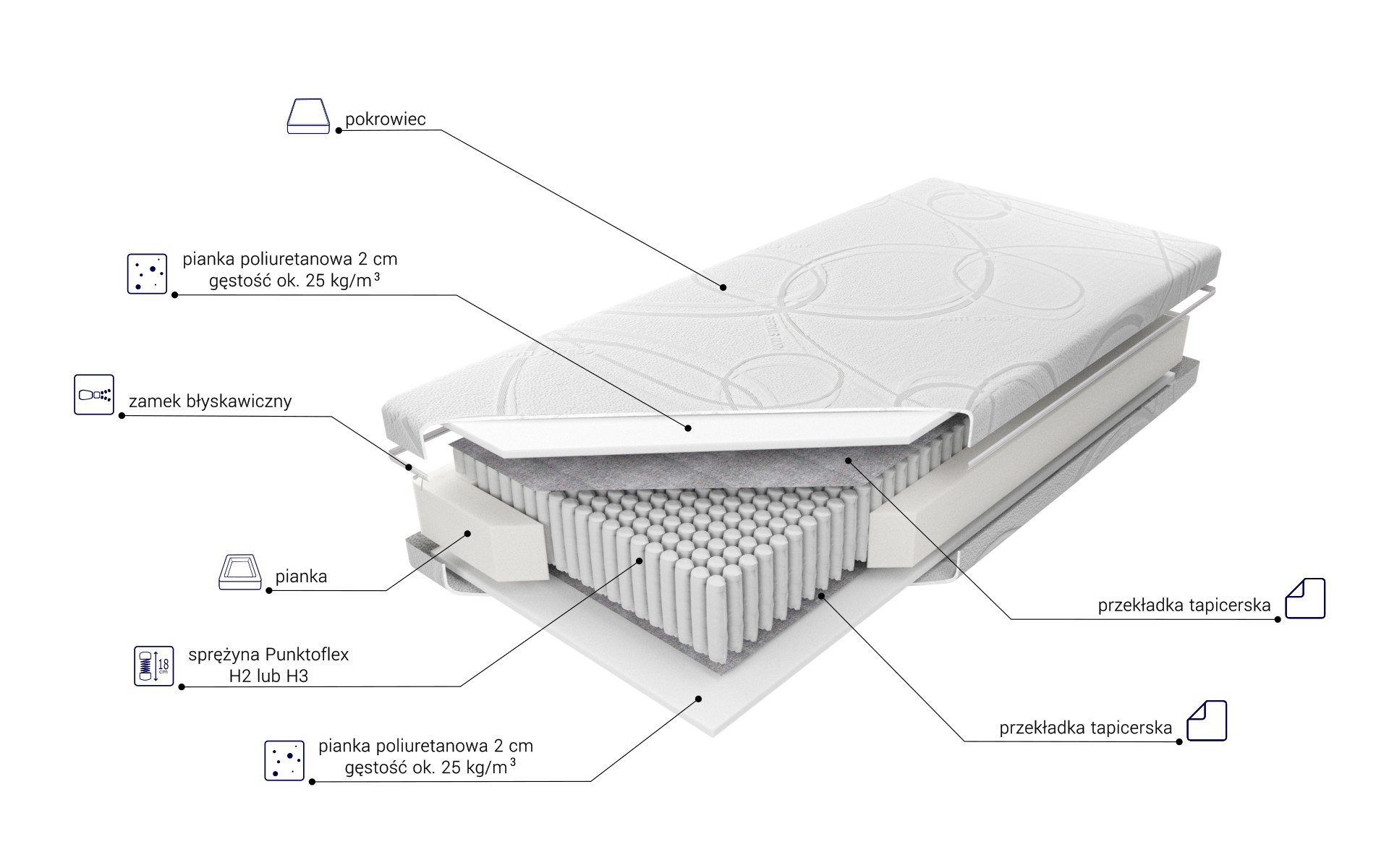 “Materac o wysokości wkładu ok. 22 cm zbudowany jest ze sprężyn Punktoflex z wysokogatunkowego drutu, umieszczonych w pojedynczych kieszonkach o średnicy 4 cm. Ilość użytych sprężyn znacząco poprawia elastyczność i zwiększa punktowe podparcie ciała. Zastosowane 18 cm sprężyny wpływają na wyjątkową wysokość i podnoszą przewiewność materaca. Obustronnie w materacu użyta została 2 cm warstwa wytrzymałej, nie odkształcającej się, pianki poliuretanowej. Zastosowana z każdej strony przekładka tapicerska doskonale izoluje, zwiększa twardość i wydłuża żywotność produktu. Istnieje możliwość wyboru twardości materaca, klient decyduje o twardości sprężyn H2 lub H3. Wykorzystanie zamka błyskawicznego, który umożliwia zdjęcie i wypranie pokrowca, znacząco ułatwia utrzymanie go w czystości.”