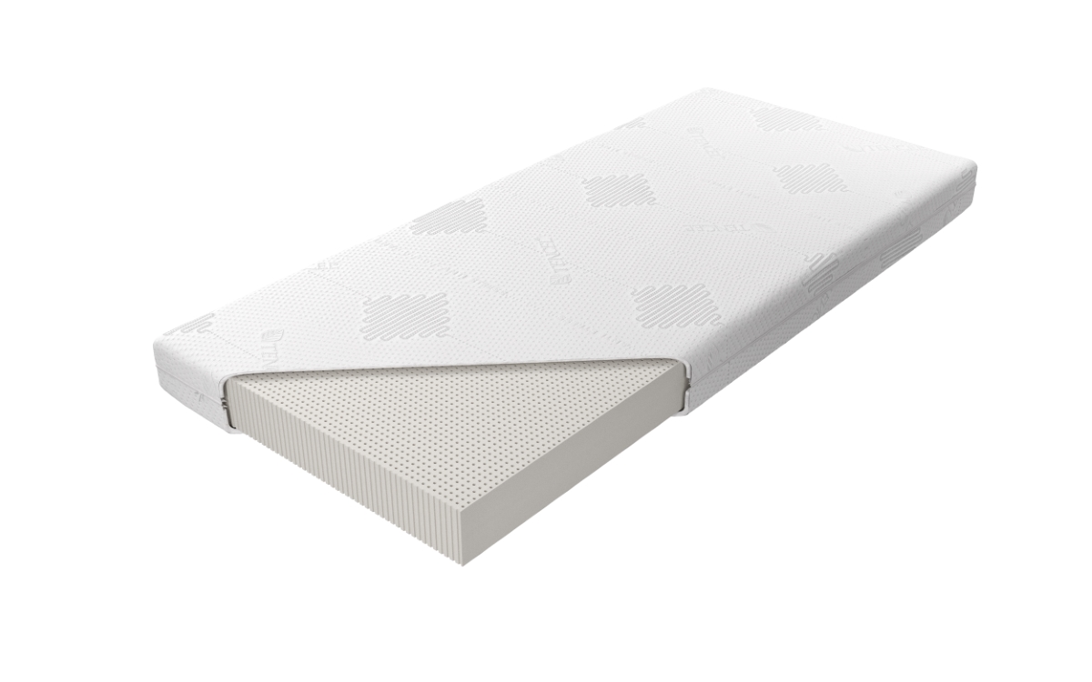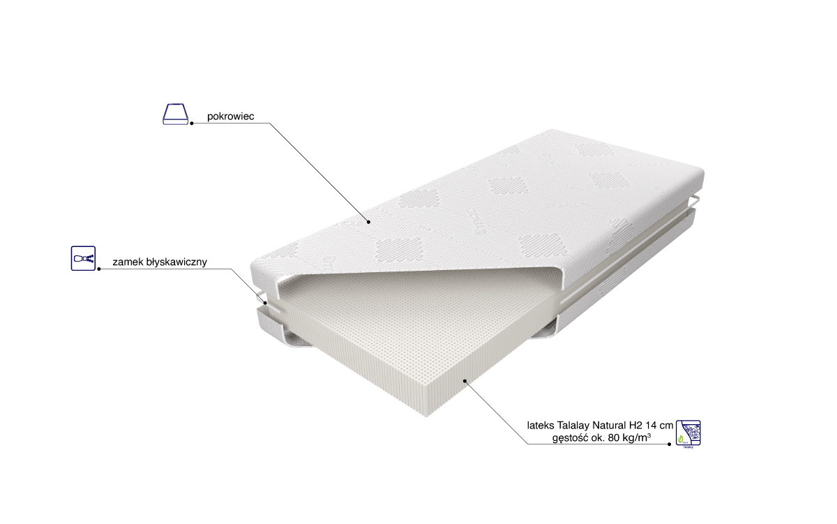 “Materac o wysokości ok. 14 cm wykonany jest z warstwy 100% naturalnego lateksu Talalay Natural o twardości H2, którego otwartokomórkowa struktura przyczynia się do doskonałej wentylacji. Zapewnia wysoki komfort i optymalne podparcie ciała podczas snu. Materac posiada dodatkowy pokrowiec wewnętrzny, zapewniający większą ochronę wkładu. Zastosowanie zamka błyskawicznego, który umożliwia zdjęcie i wypranie pokrowca zewnętrznego, znacząco ułatwia utrzymanie go w czystości.”