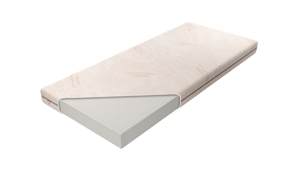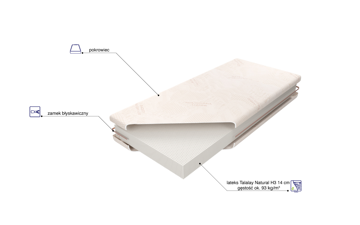 “Wkład materaca o wysokości ok. 14 cm wykonany jest z 100% naturalnego lateksu Talalay Natural o twardości H3, którego otwartokomórkowa struktura przyczynia się do doskonałej wentylacji. Zapewnia wysoki komfort i optymalne podparcie ciała podczas snu. Materac posiada dodatkowy pokrowiec wewnętrzny, zapewniający większą ochronę wkładu. Zastosowanie zamka błyskawicznego, który umożliwia zdjęcie i wypranie pokrowca zewnętrznego, znacząco ułatwia utrzymanie go w czystości.”