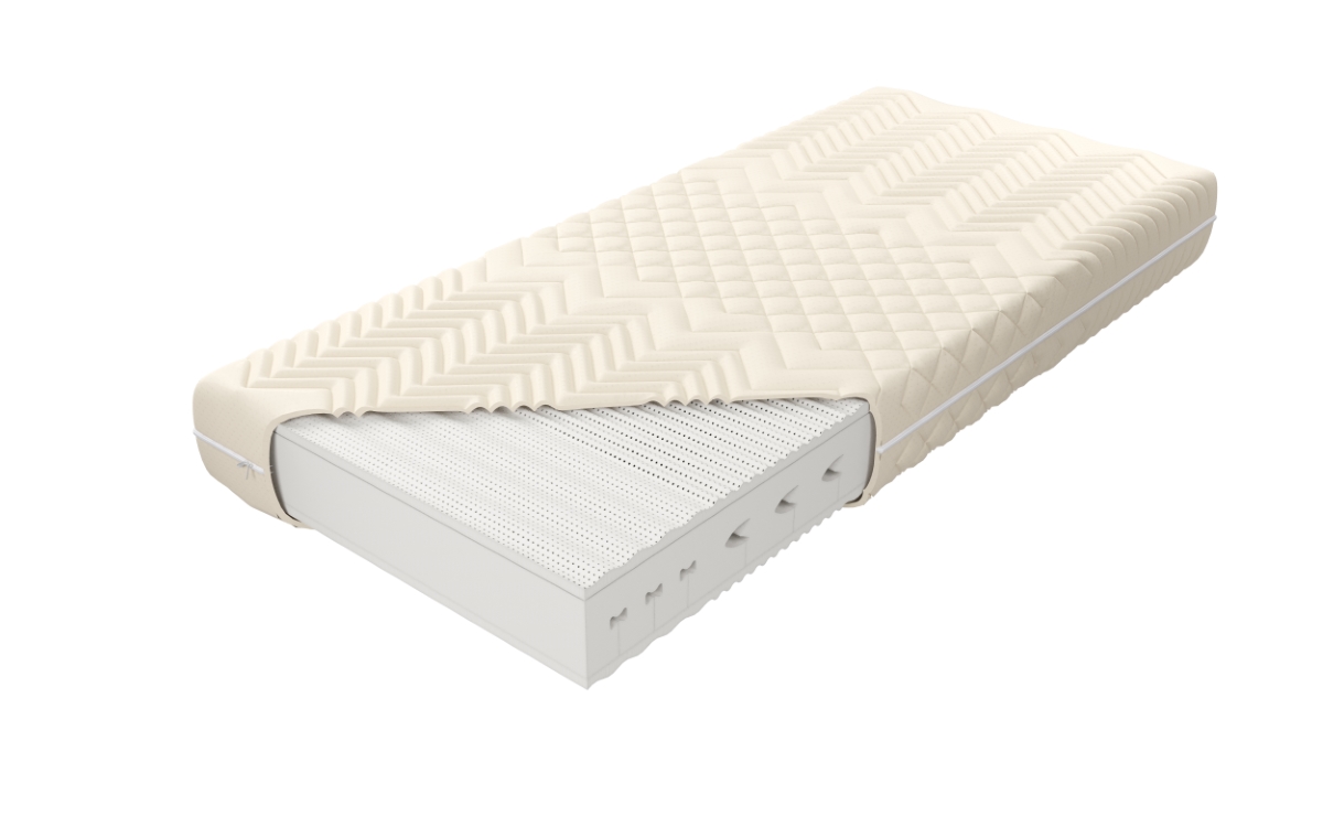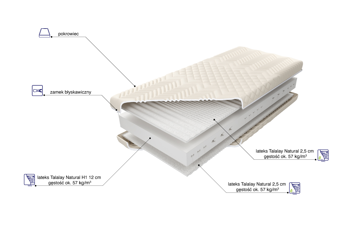 “Wkład materaca o wysokości ok. 17 cm złożony jest z 100% naturalnego lateksu. Rdzeń materaca stanowi 12 cm wkład lateksu naturalnego Talalay o twardości H1, wycinany konturowo, obłożony obustronnie płatami lateksu naturalnego ciętego w fale. Posiada siedem stref twardości, utrzymujących poszczególne części ciała. Zastosowana struktura przyczynia się do doskonałej wentylacji, zapewnia komfort i optymalne podparcie. Ten sprężysty materac polecany jest osobom o raczej niewielkiej wadze. Posiada dodatkowy pokrowiec wewnętrzny, zapewniający większą ochronę wkładu. Zastosowanie zamka błyskawicznego, który umożliwia zdjęcie i wypranie pokrowca zewnętrznego, znacząco ułatwia utrzymanie go w czystości.”